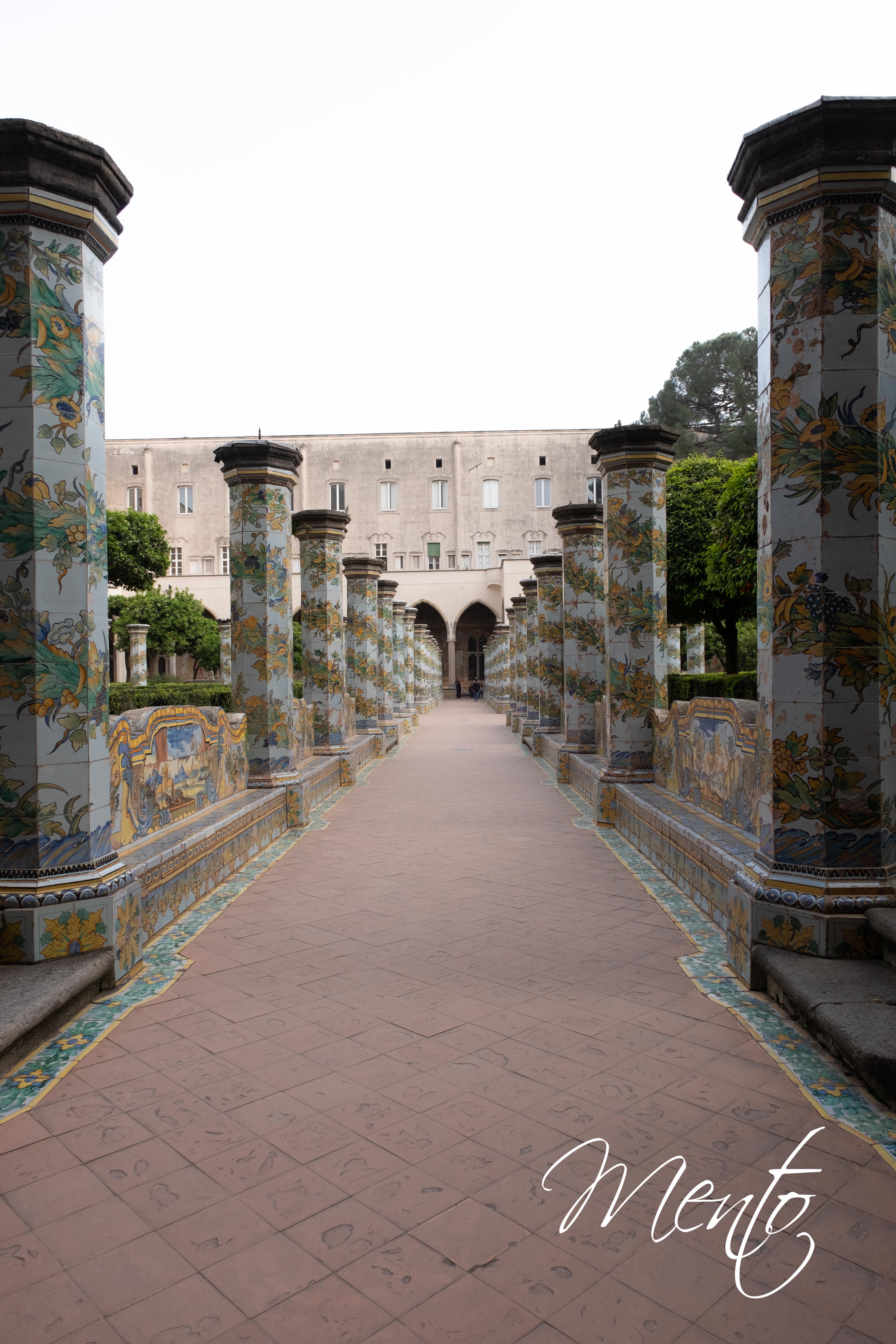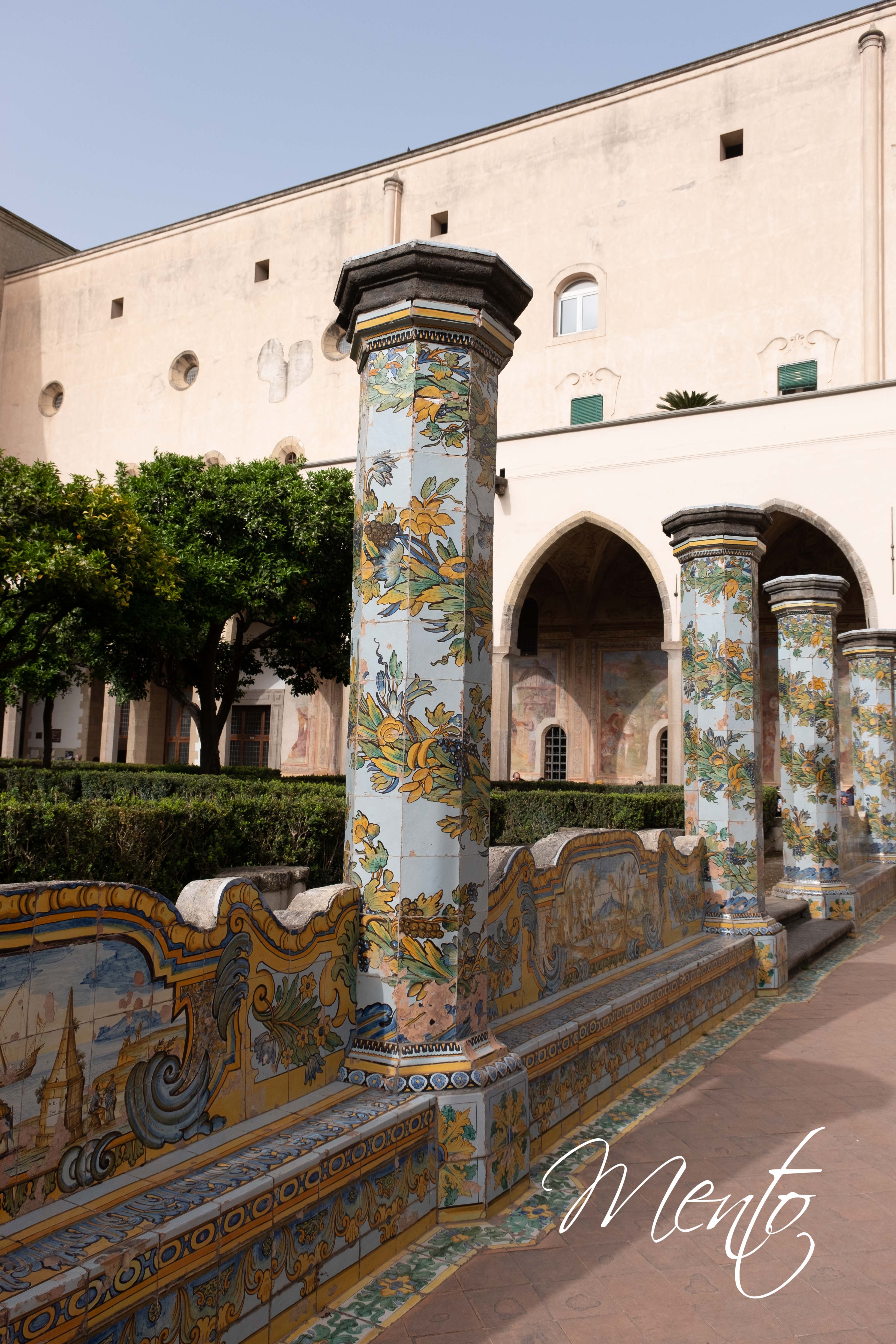 La visita continua en el claustro de la Iglesia de Santa Clara, un verdadero tesoro artístico del siglo XIV. Su belleza es realzada por las columnas revestidas con exquisitos azulejos decorados con motivos florales y por los muretes y bancos adornados con escenas costumbristas de la época. Este monasterio franciscano es un testimonio del esplendor gótico en Nápoles y este claustro con la luz de la tarde es un bello decorado para hacer fotos.