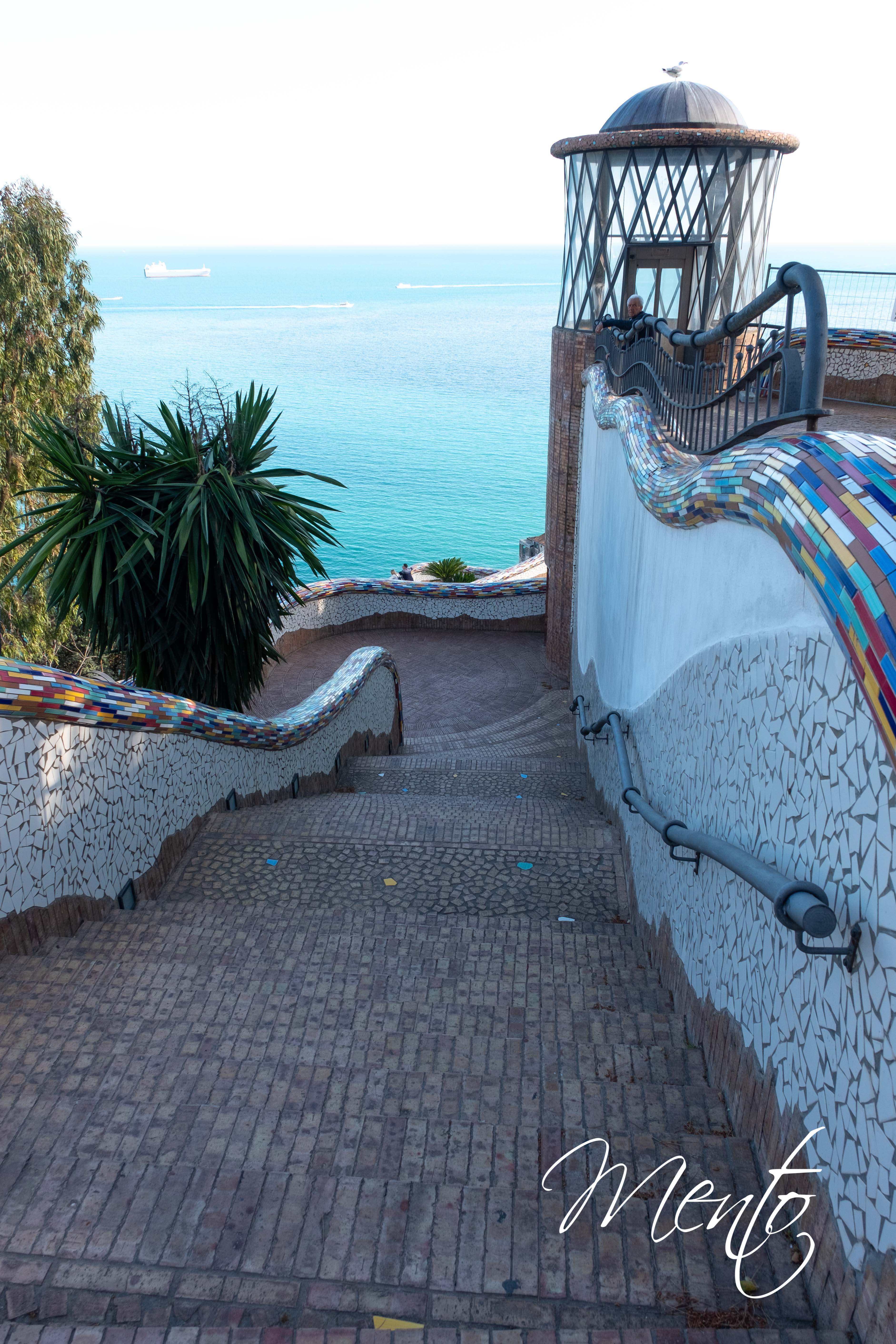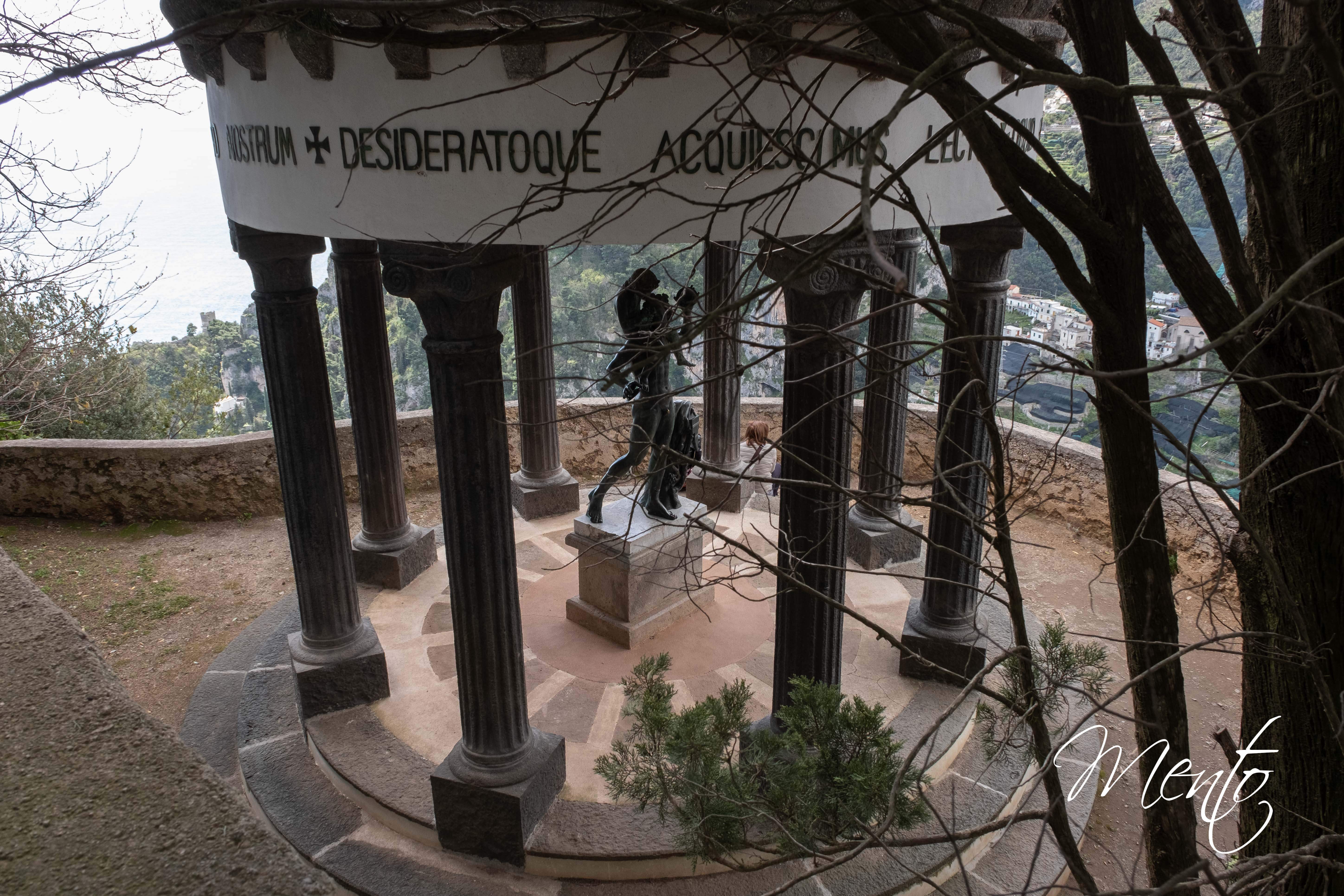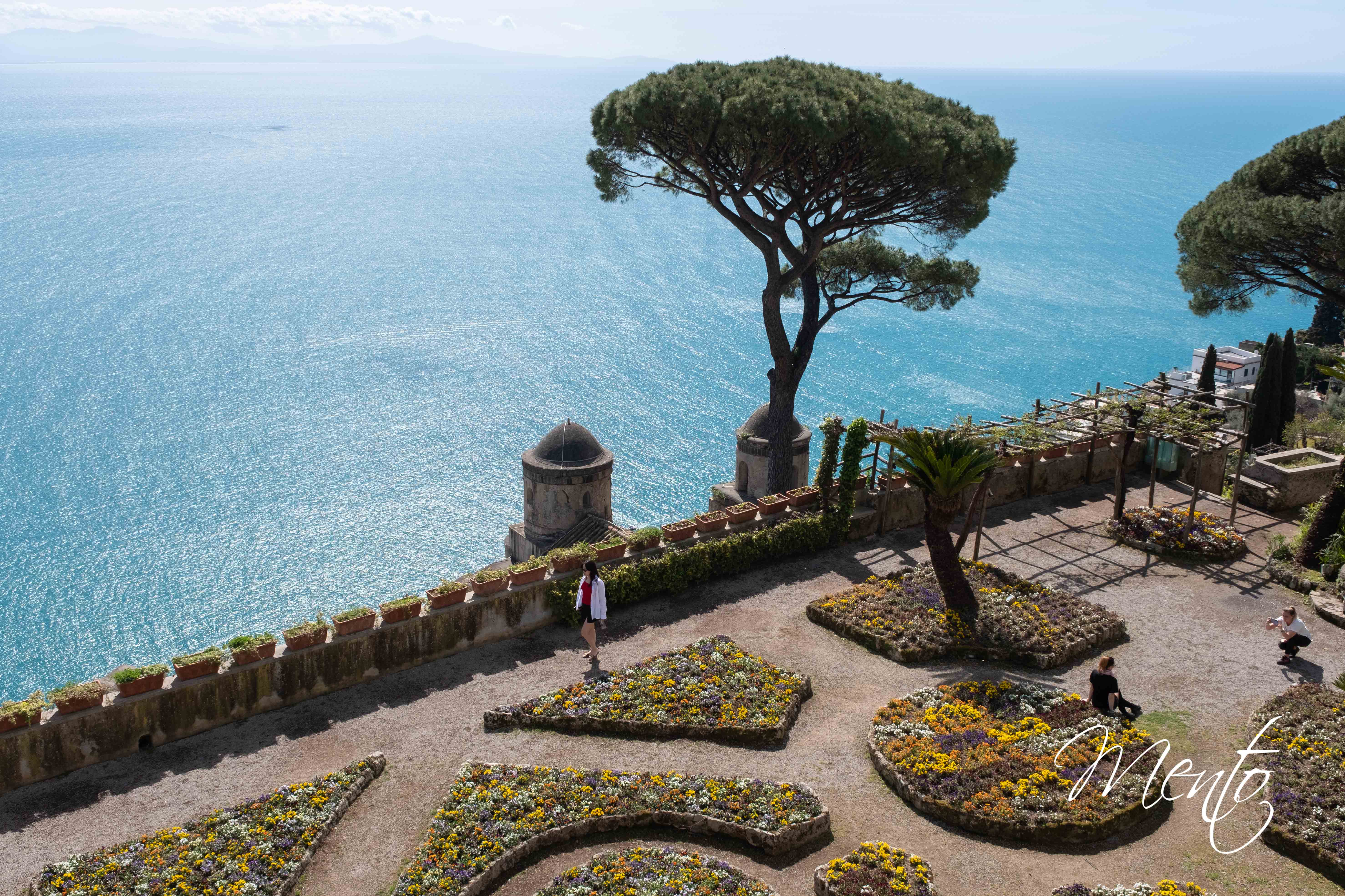 Después de algunas fotografías en la playa, emprendemos el ascenso al Belvedere Mortella por el Sentiero dei Limoni, un antiguo camino que serpentea entre bancales de limoneros hasta el pueblo vecino, pero nosotros no haremos más que una extensa escalinata de más de 300 peldaños hasta el mirador. Desde lo alto, las vistas son magníficas: las casas y la costa se despliegan enmarcadas por las terrazas cultivadas de limones, símbolo por excelencia de la economía y la identidad de la región. No obstante, los árboles están cubiertos con telas negras para protegerlos, lo que resta algo de encanto al paisaje.