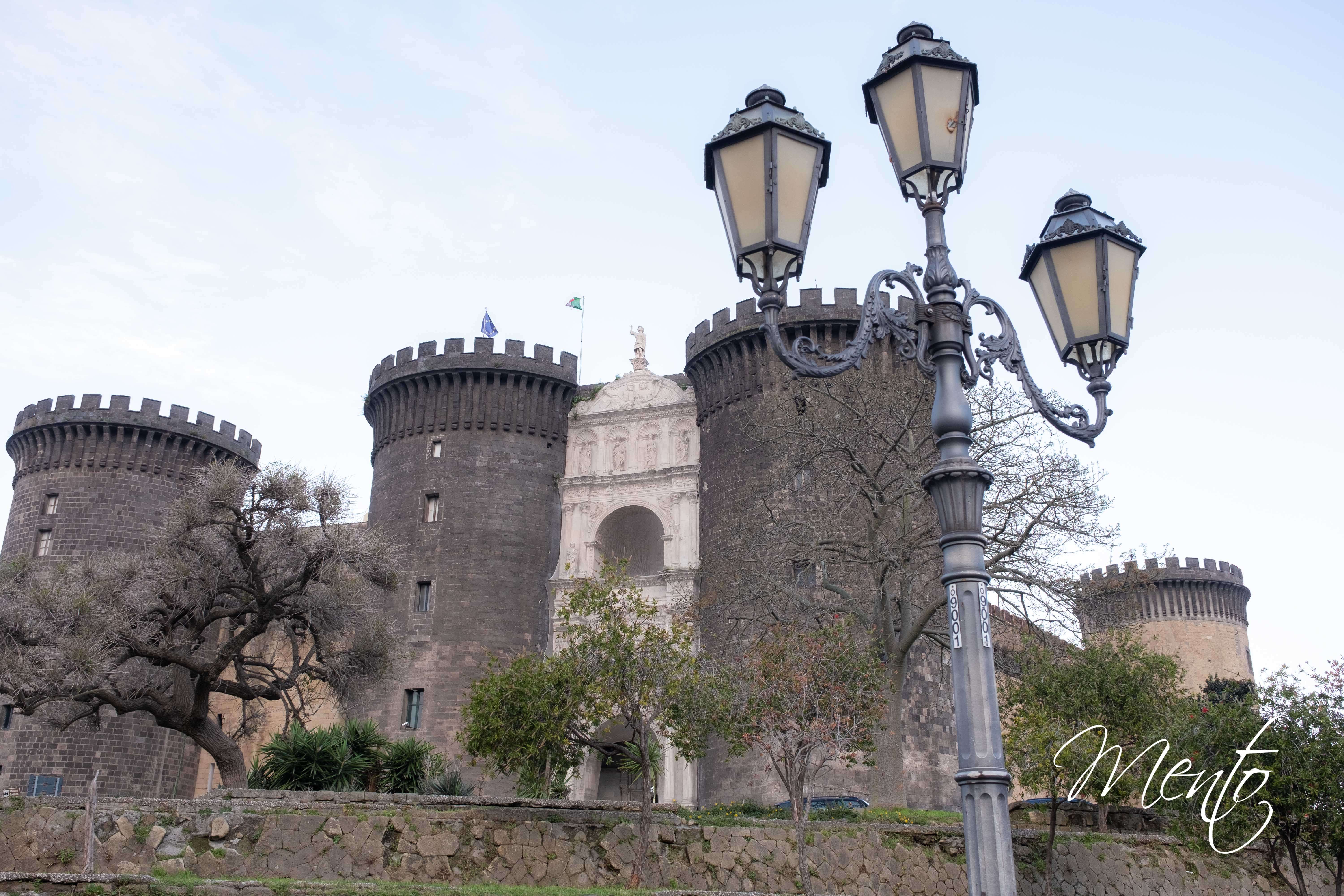 Antes de llegar a la Plaza del Plebiscito, realizamos una parada frente al Castel Nuovo, también conocido como Maschio Angioino. Esta fortaleza medieval, erigida en el siglo XIII por Carlos I de Anjou y remodelada posteriormente por Alfonso V de Aragón, se encuentra ahora en proceso de restauración. Tras tomar algunas fotografías, proseguimos hacia el Palacio Real, una de las residencias históricas de los monarcas borbones.