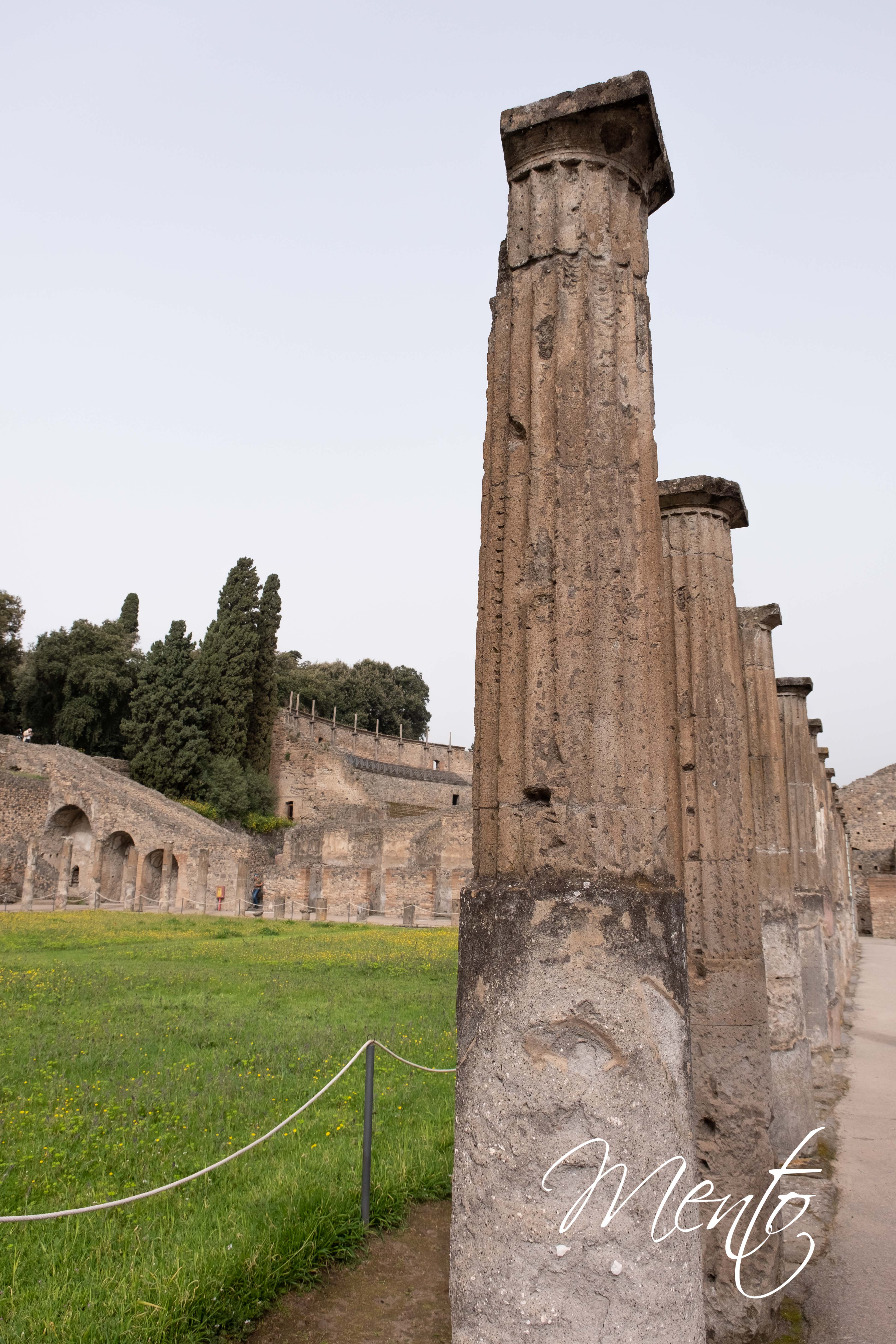 Accedemos al recinto a través del “Antiquarium” y recorremos el Viale delle Ginestre hasta ingresar en Pompeya por la «Caserna del Gladiador». Este edificio, que en su época sirvió como alojamiento para los gladiadores, cuenta con un imponente pórtico con columnas en sus cuatro lados, rodeando un amplio patio central. Desde allí se accede a dos importantes espacios teatrales de la ciudad: el Teatro Grande y el Odeón o Teatro Pequeño. El primero, con capacidad para aproximadamente 5.000 espectadores, se cree que disponía de un sistema de toldos para proteger al público del sol, mientras que el segundo es un recinto más modesto, aunque exquisitamente diseñado, con una estructura completamente cerrada que ofrecía una acústica excepcional.