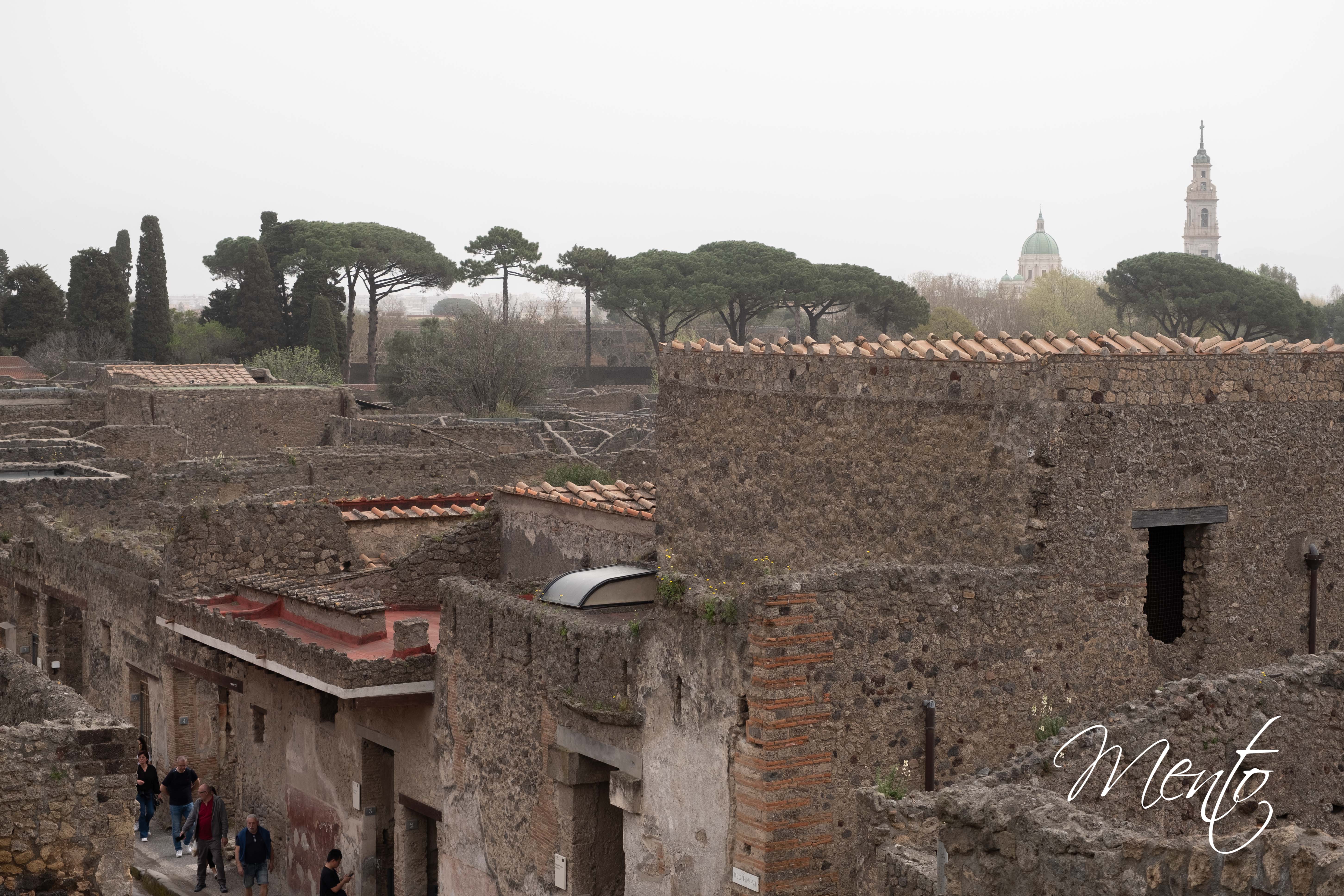 Seguimos nuestro recorrido por la Vía de la Abundancia y ascendemos hasta la «Casina dell’Aquila», una construcción moderna inspirada en la arquitectura pompeyana y situada en un punto estratégico que ofrece una vista panorámica de toda la ciudad. Allí esperábamos disfrutar de un café, pero nos encontramos con la decepcionante sorpresa de que el establecimiento está cerrado. Al menos, disponemos de un baño.