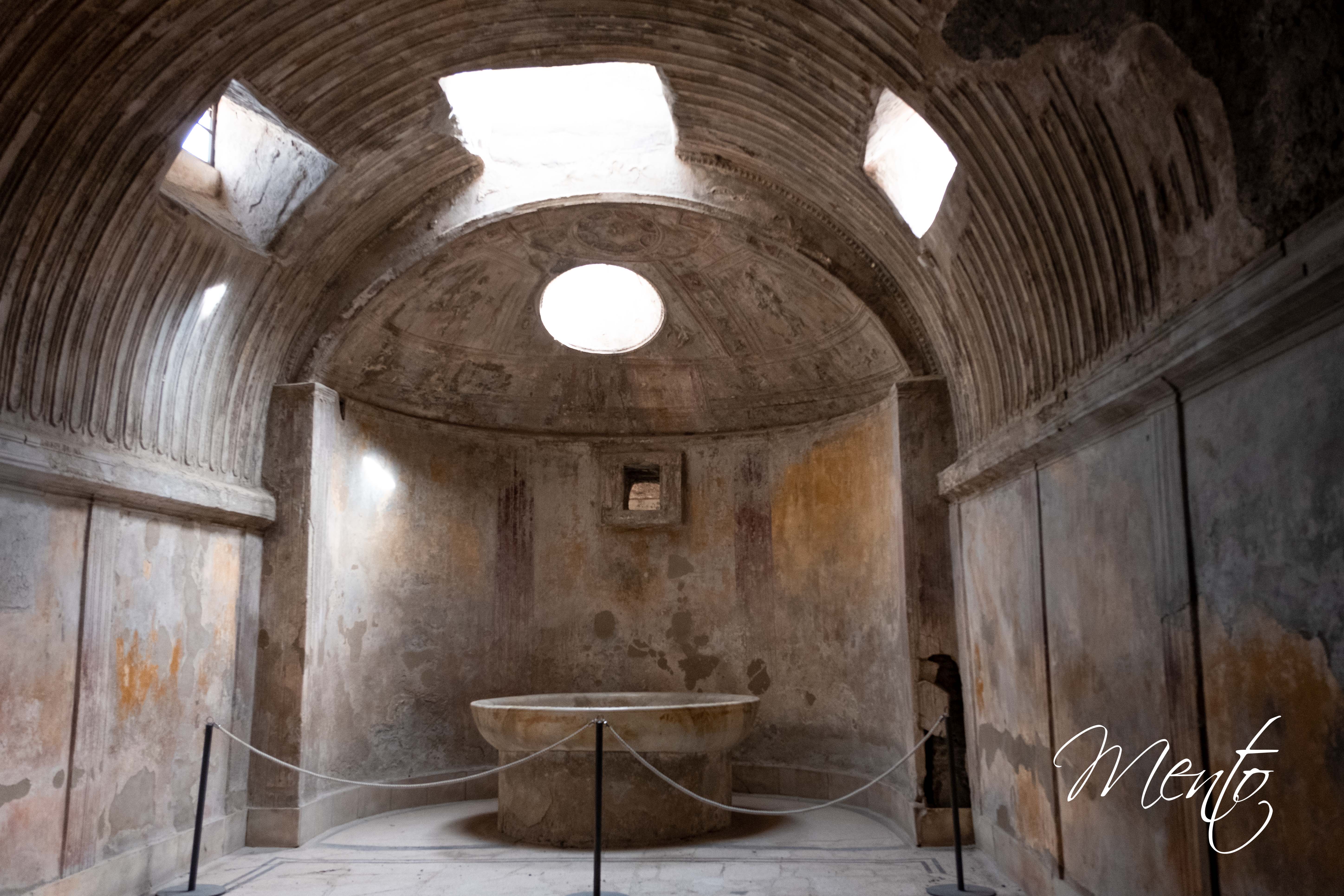 Tras esta visita, hacemos una pausa para degustar un café capuchino, antes de adentrarnos en las termas del foro. Allí, un «influencer» acapara la atención de los visitantes con poses exageradas, mientras aguardamos nuestro turno para hacer alguna foto. Exploramos las distintas estancias de estos baños públicos, que constituyen un magnífico ejemplo de la vida cotidiana en la antigua Pompeya.