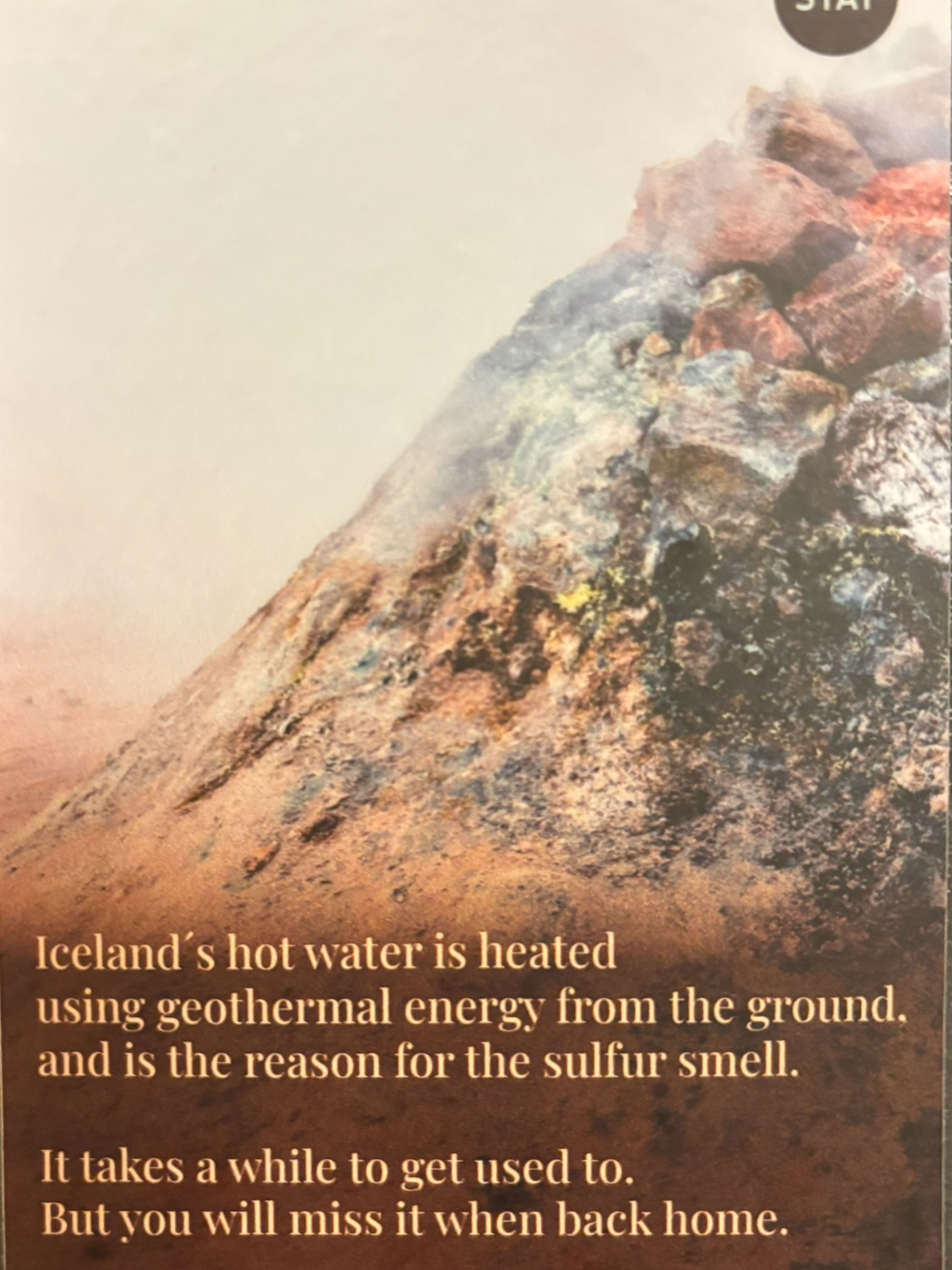 Como en toda Islandia, y así lo anunciaban diversos carteles en las viviendas, el agua caliente procedía de aguas termales por lo que en ocasiones olía un poco a azufre (más ligeramente que en las zonas geotermales). En el país el agua caliente se canaliza desde estos manantiales por conductos diferentes al agua fría de la que se dice que es la más pura de Europa, invitándote a beber siempre del grifo, incluso en las diferentes áreas de servicio en lugares turísticos. No es necesario en ningún momento comprar agua embotellada.