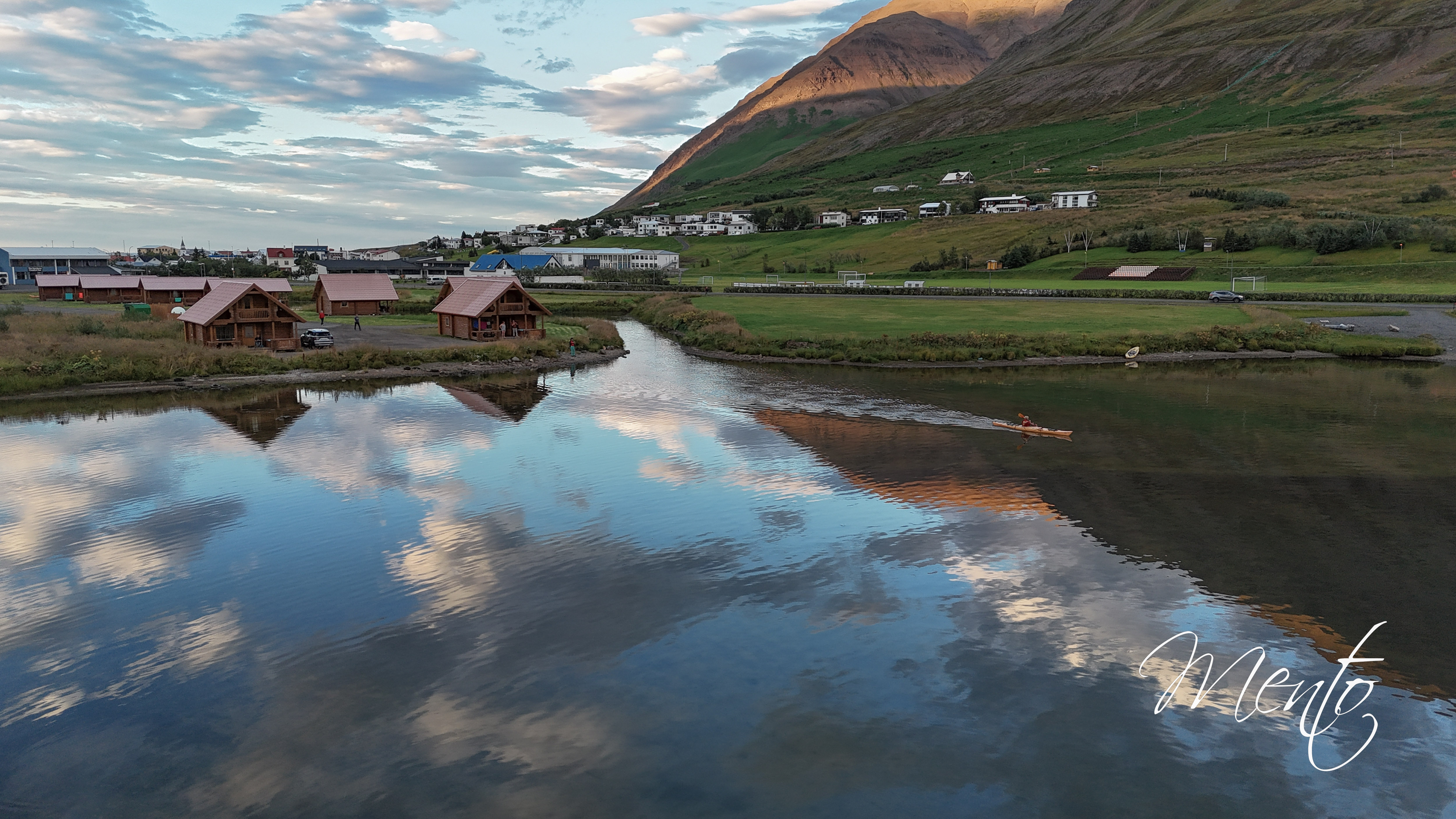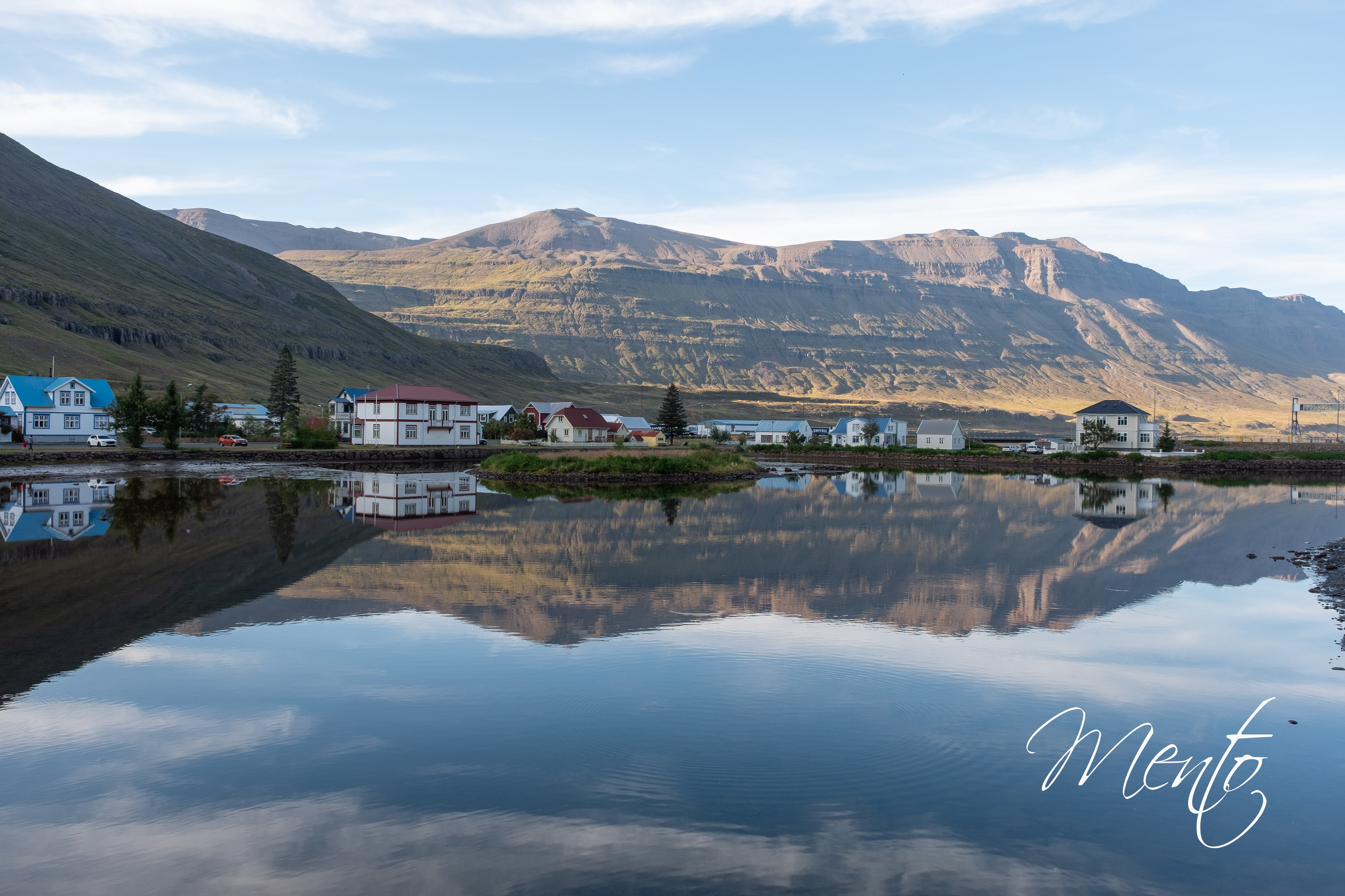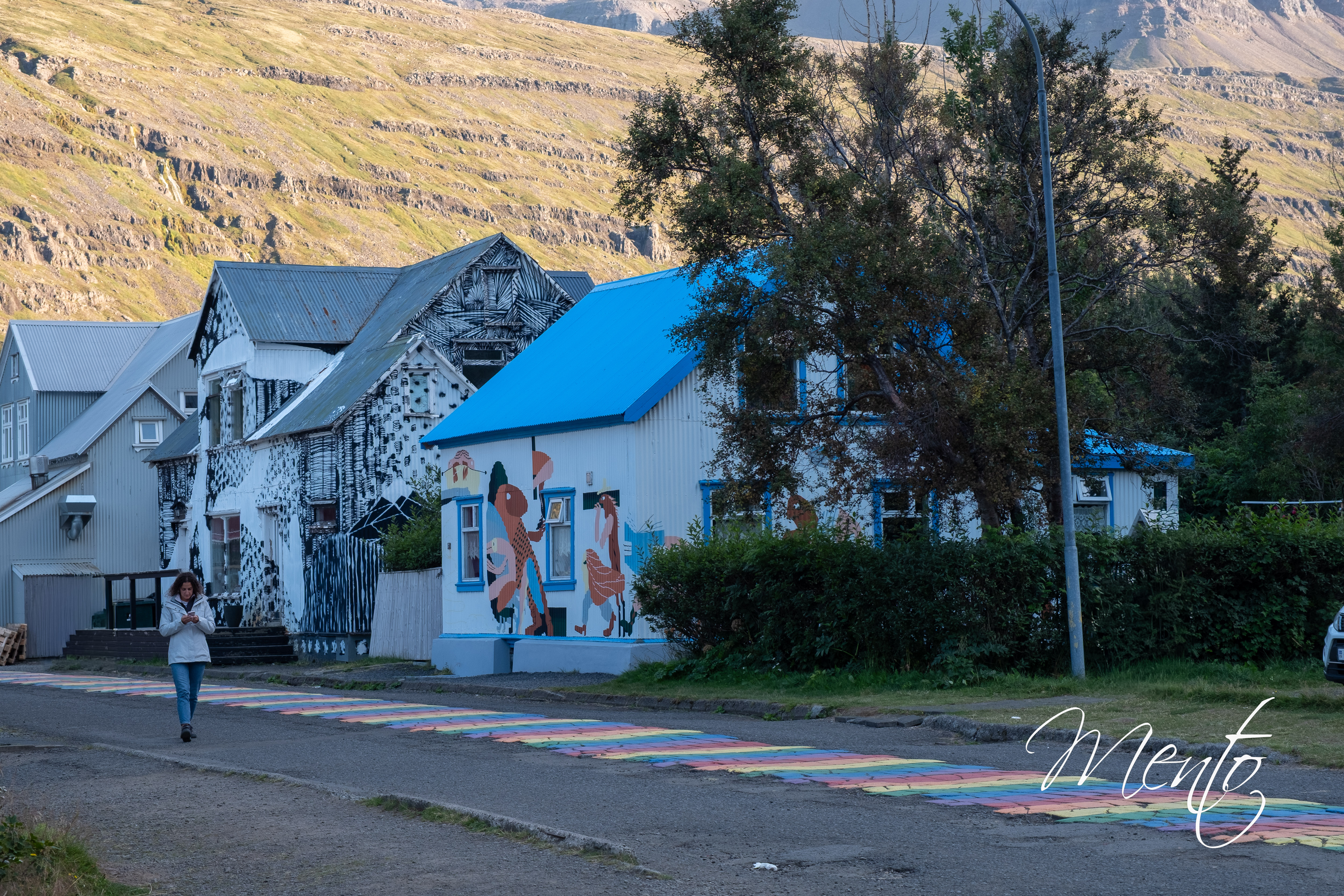 Nos instalamos mínimamente, ponemos a llenar el hot tub y en cuanto estamos listos, interrumpimos el llenado y nos marchamos a visitar Seyðisfjörður, un encantador pueblo costero al fondo del fiordo del mismo nombre. Fundado en el siglo XIX por comerciantes noruegos, conserva una marcada influencia escandinava en su arquitectura de casas de madera de colores. La luz del atardecer se refleja sobre el fiordo, tan quieto que parece un espejo. Es un pueblo pequeño, pero bastante animado. Enseguida encontramos la calle que lo ha hecho famoso por su “paso de cebra” pintado con los colores del arco iris, símbolo del apoyo local al colectivo LGTBI y una muestra del espíritu inclusivo y artístico que caracteriza a la comunidad. Al fondo, una pequeña iglesia azul (Bláa Kirkjan) de torre afilada que completa la icónica imagen.