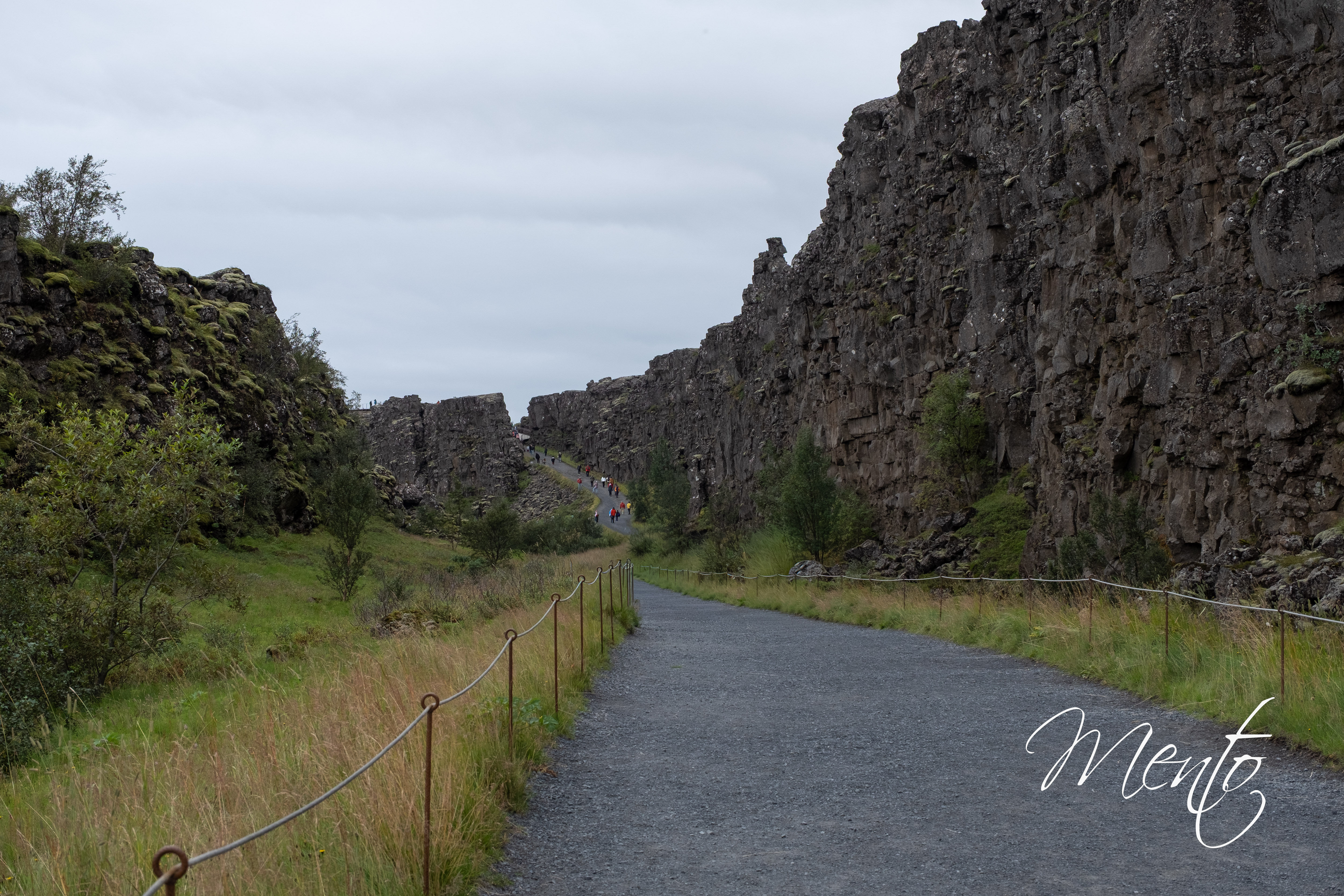 Aparcamos junto al centro de visitantes, en un estacionamiento de pago que da derecho a usar todos los del parque durante un día. Primero nos dirigimos a un mirador que ofrece una vista general de la falla, y luego descendemos para caminar entre las paredes de roca que determinan la separación entre continentes. El sendero conduce hasta el Lögberg, la “Roca de la Ley”, donde se celebraban las asambleas vikingas. Allí ondea una bandera islandesa como símbolo de su relevancia histórica.