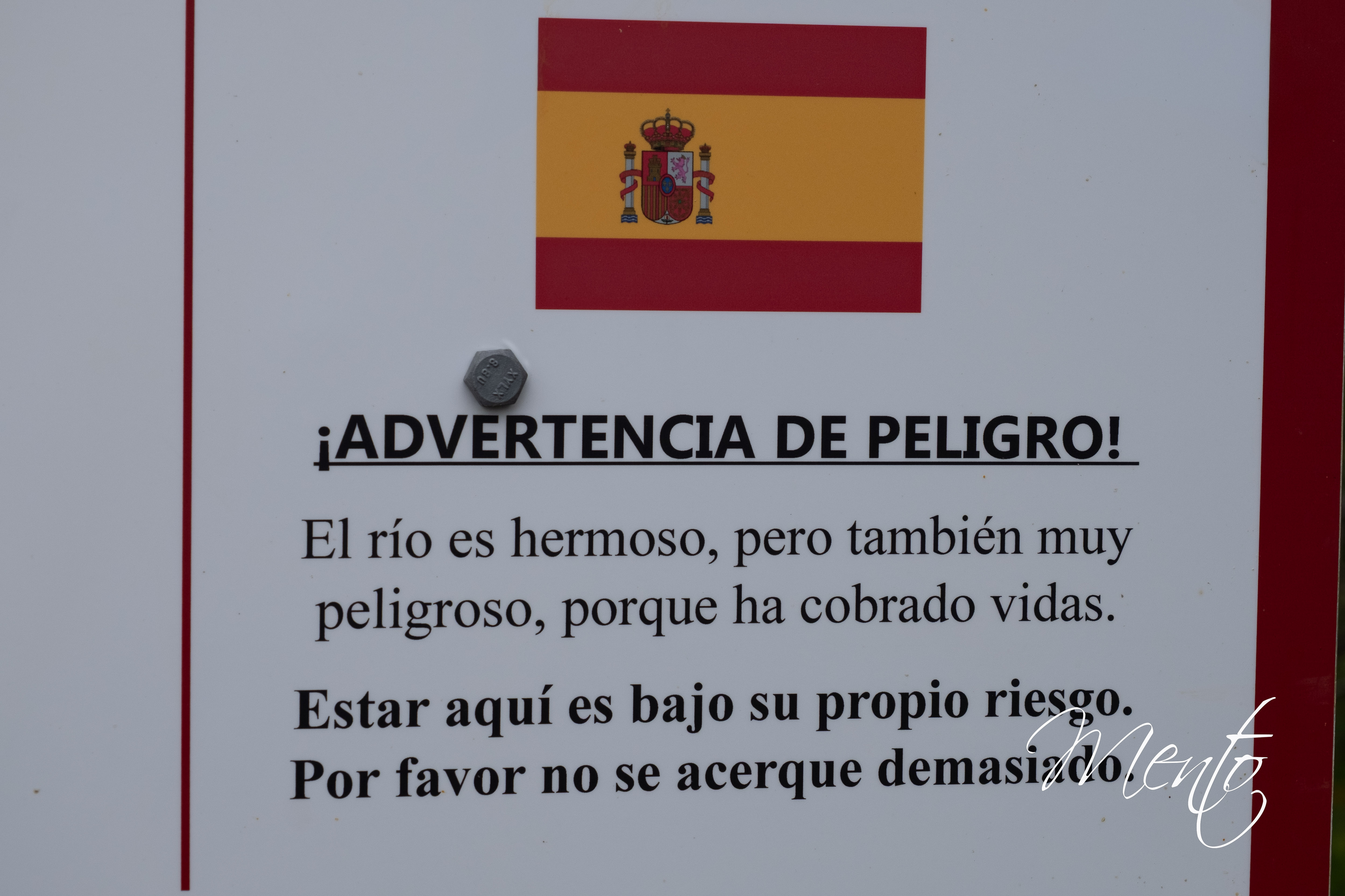 Un puente que cruza las aguas del río permite obtener las mejores vistas. Nos hace mucha gracia el cartel que dice: “El río es muy hermoso, pero también muy peligroso”. Hay muchos avisos de no salirse de las sendas acotadas.