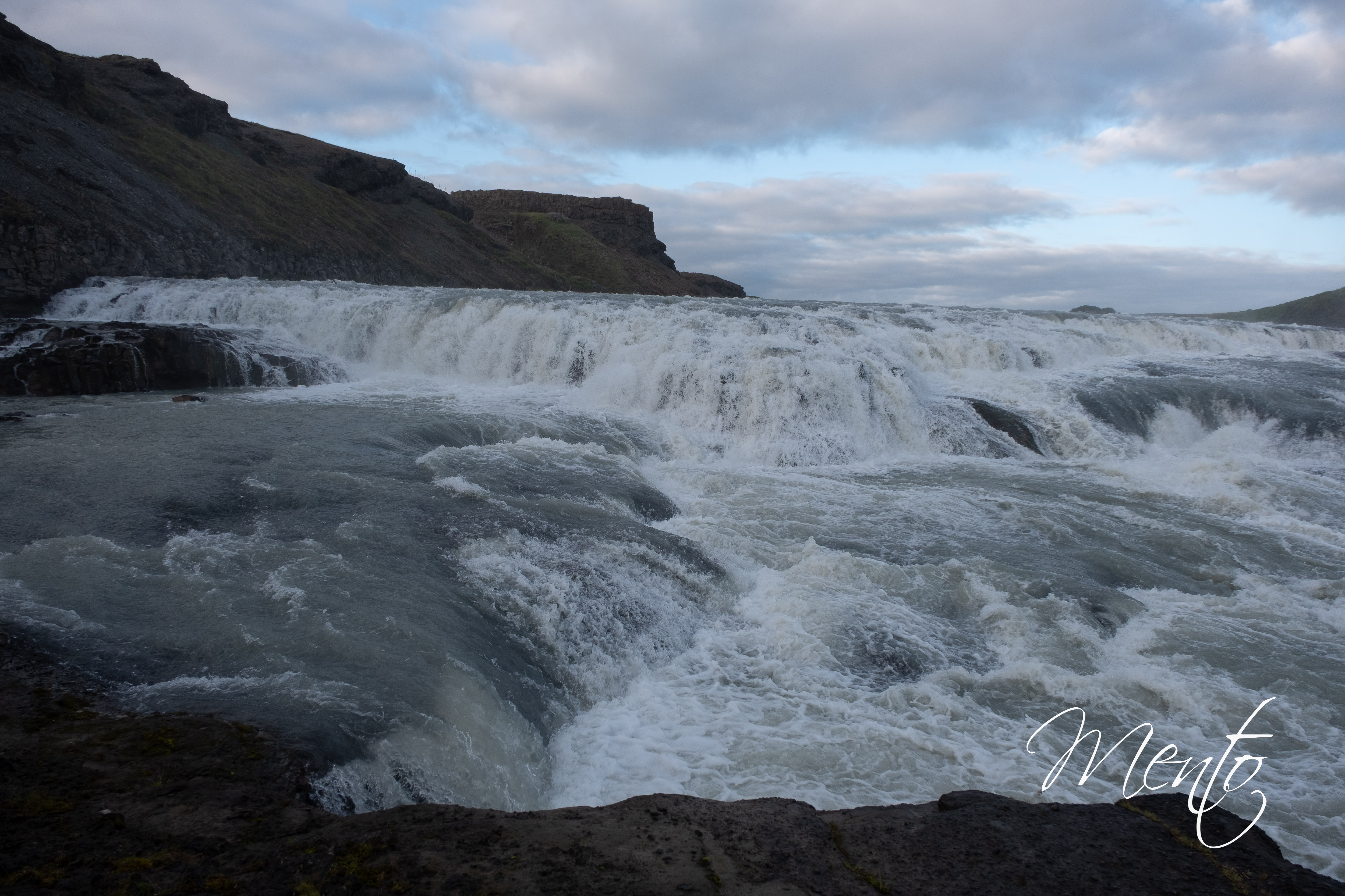 Caminando brevemente llegamos al mirador sobre la cascada Gullfoss (la “cascada dorada”). ¡Impresionante! Una enorme masa de agua se precipita sobre una grieta en la llanura, creando un estruendo que se escucha a cientos de metros.