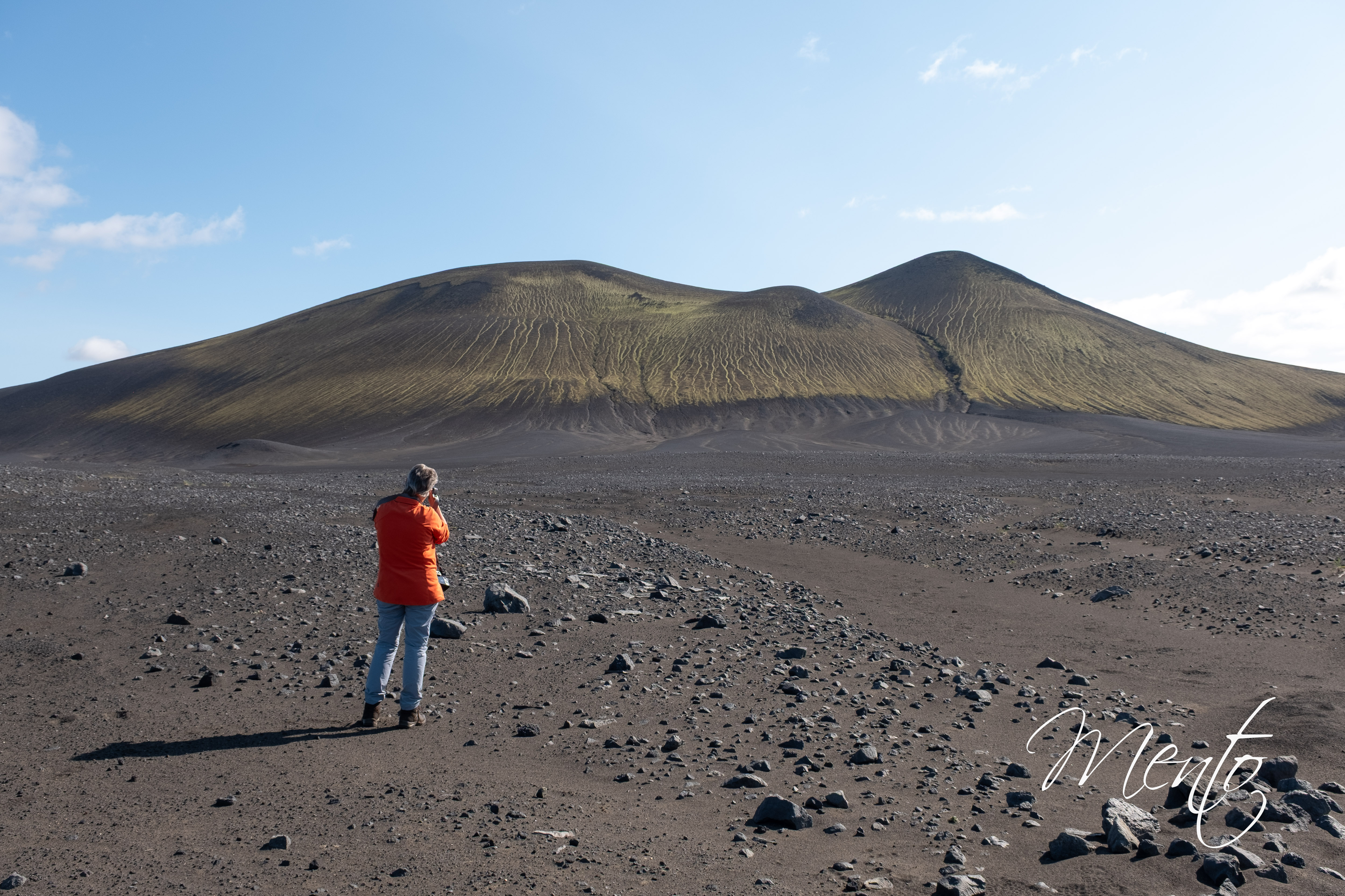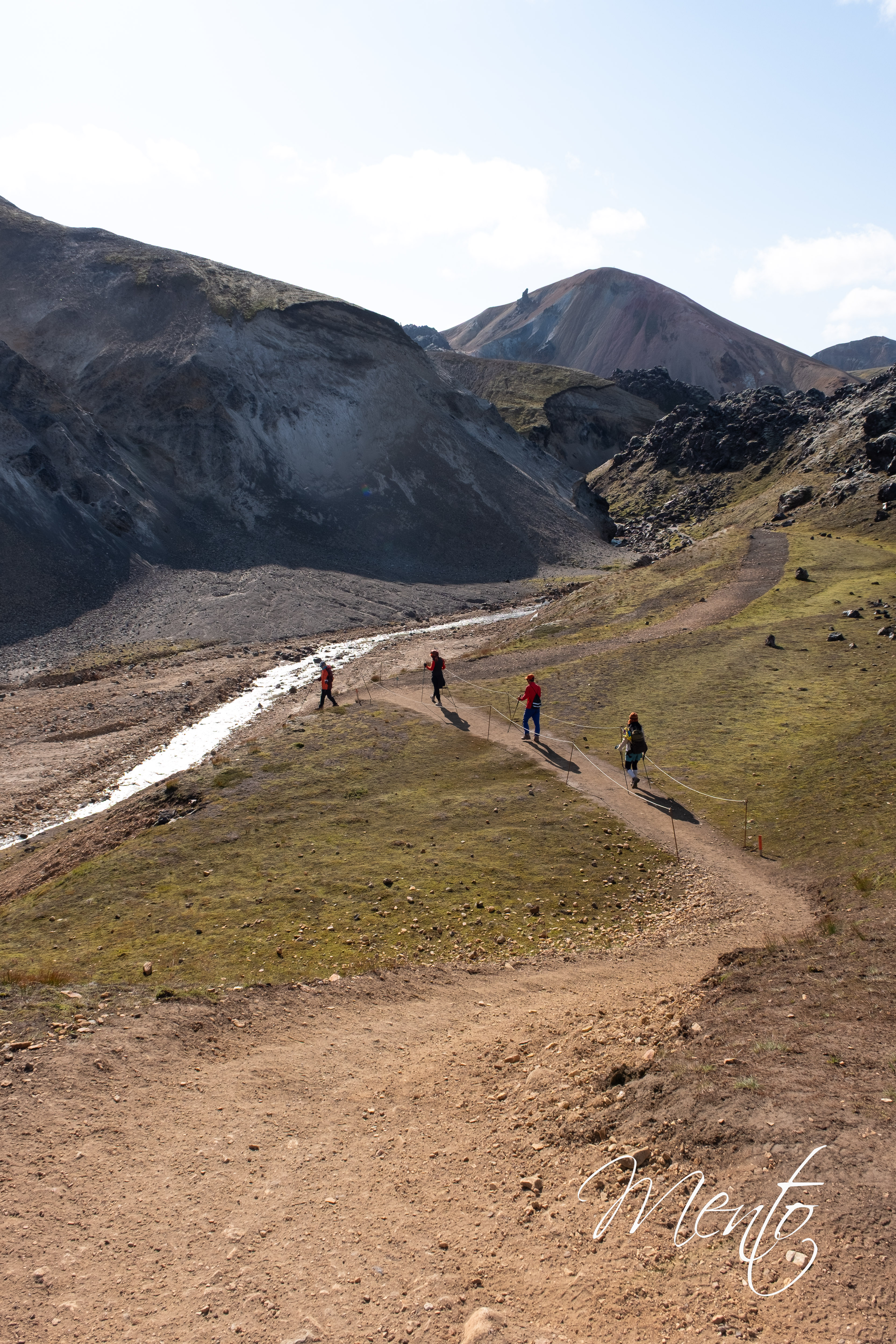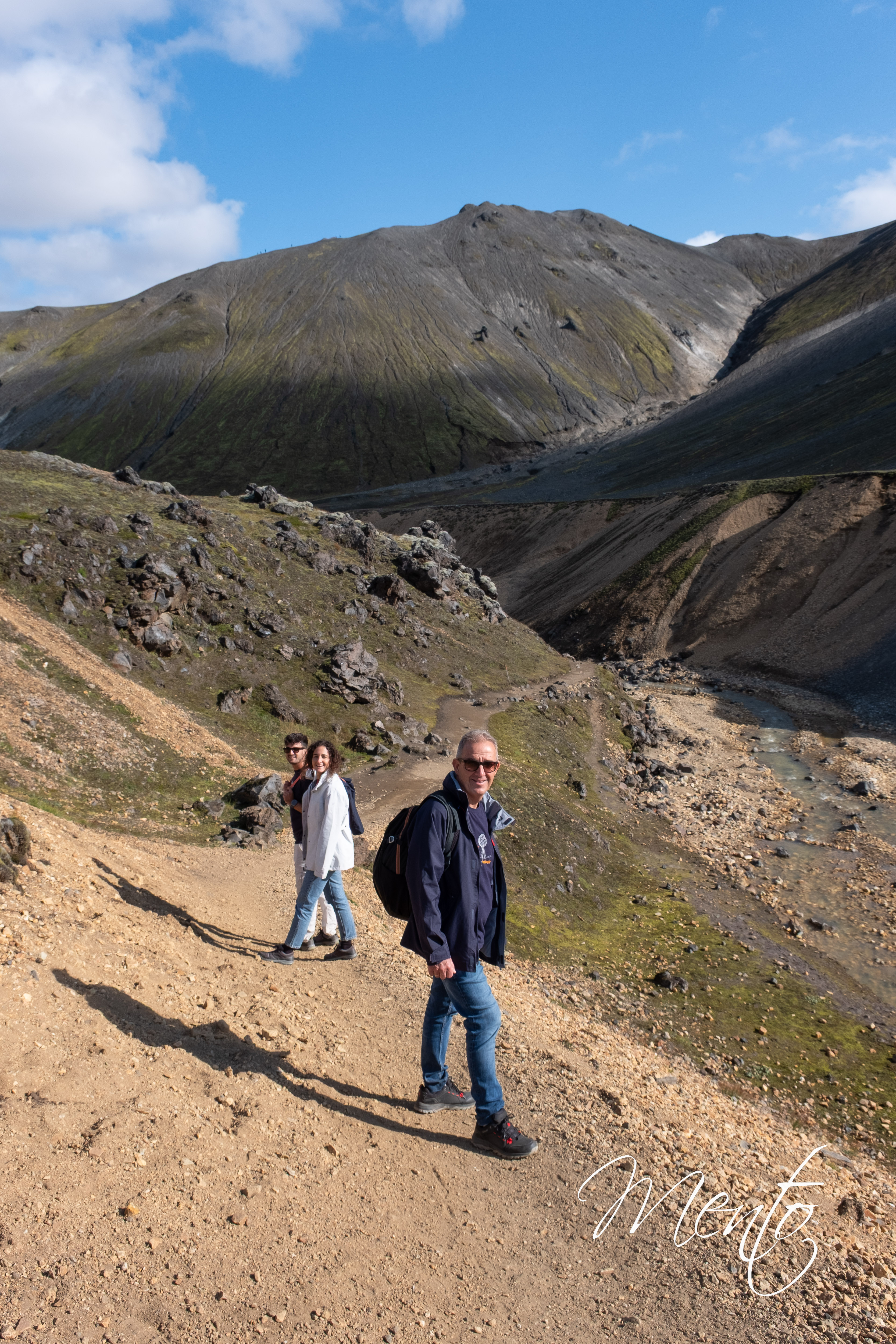 Caminando por una senda entre los campos de lava podemos apreciar que está rodeada por montañas de colores que contrastan con la negra lava salpicada de brillantes trozos de obsidiana. En el punto más alejado al refugio, donde la lava parece terminar, se extiende un enorme prado de arena rodeado de colinas que crean un paisaje de cuento. A nuestra izquierda llevamos un rato viendo el denso humo blanco de diversas fumarolas junto a las que pasa la senda que recorremos. El entorno en esa zona tiene un toque mágico e irreal. Como nos sucedió viniendo en el coche, también aquí nos encontramos con múltiples cambios en el apasionante paisaje que nos ofrece fotos increíbles.