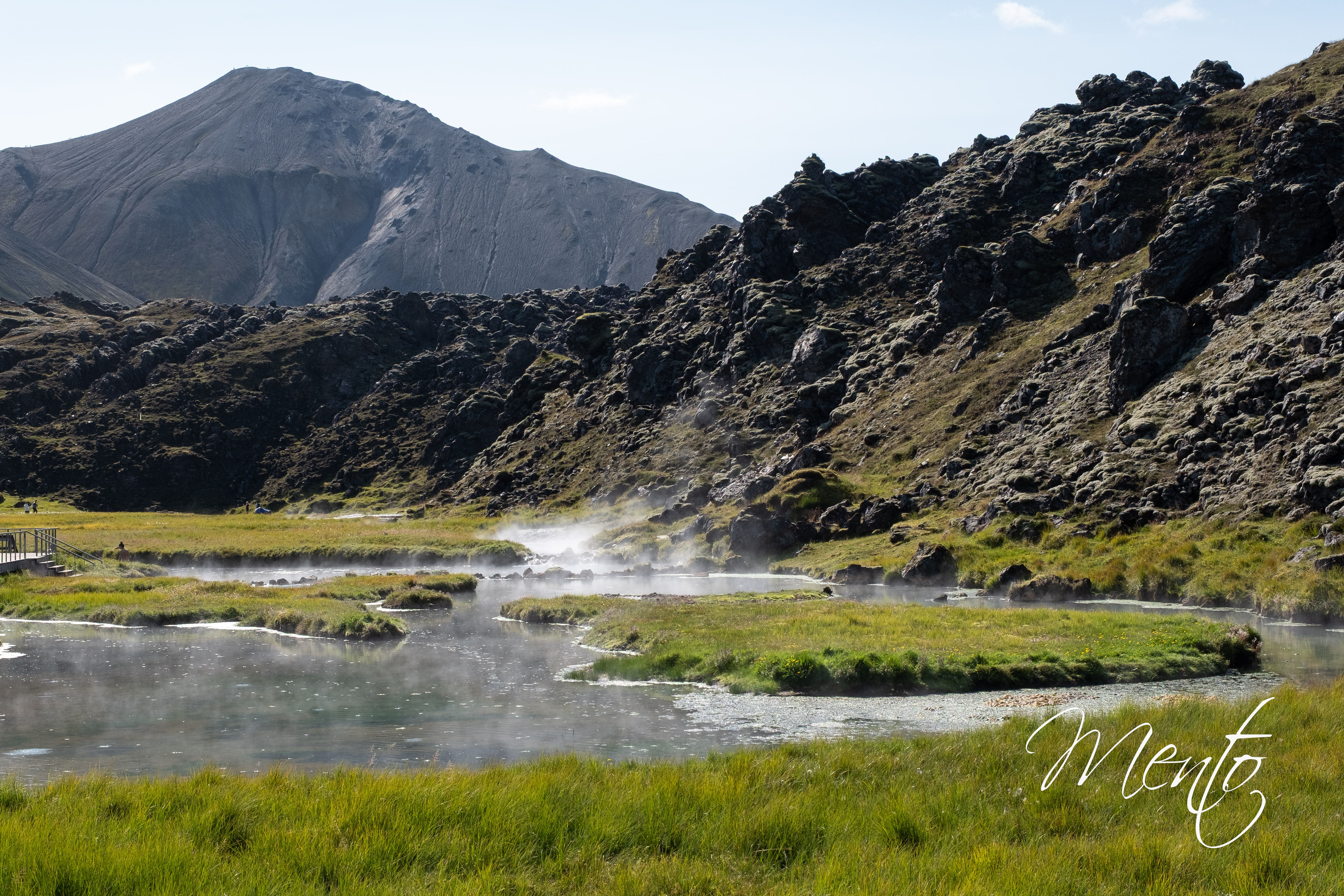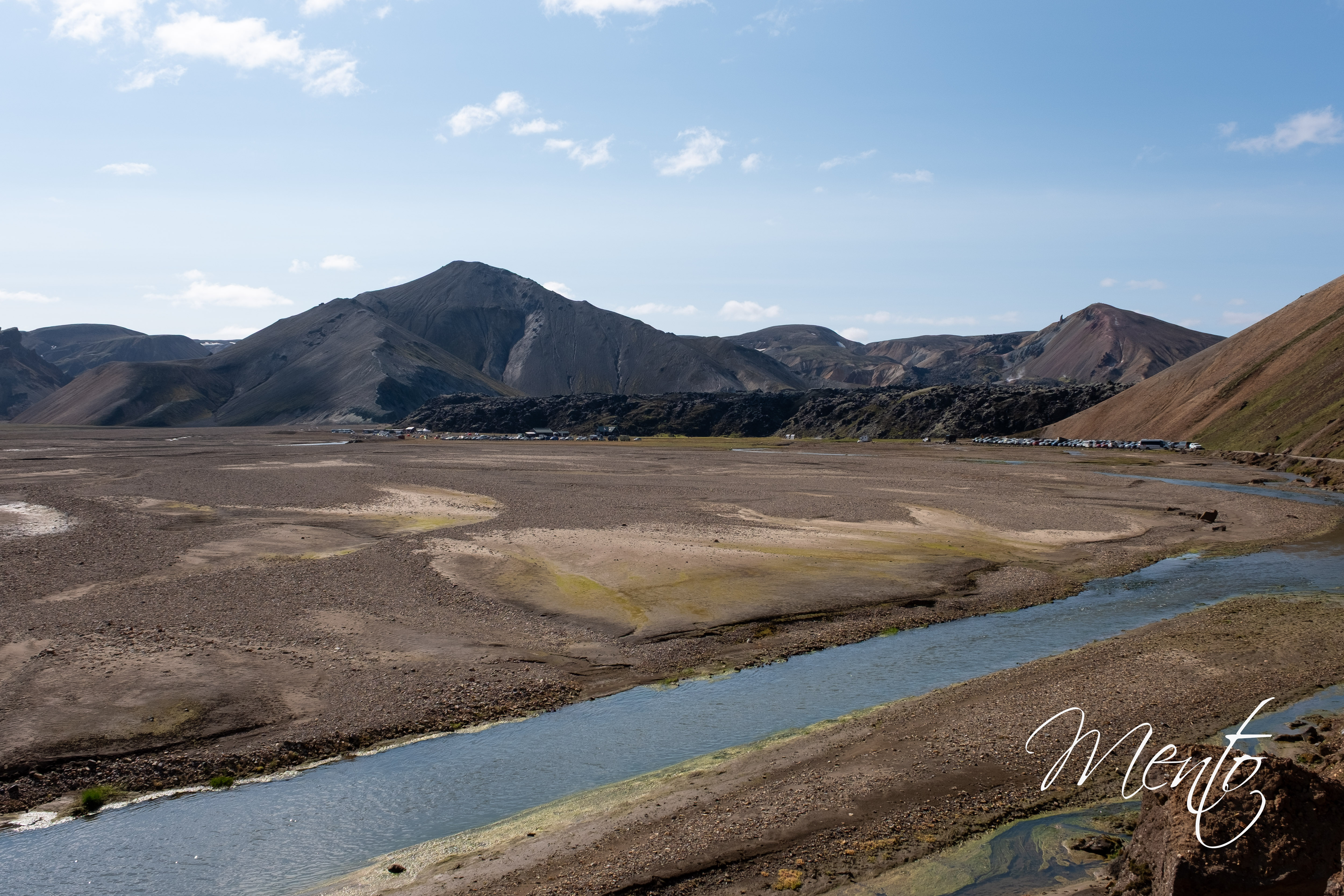 Ya desde aquí, nada más bajar del coche, se tiene una clara panorámica del lugar. En medio de la explanada donde se encuentran las construcciones del parque, destaca la enorme lengua de lava conocida como Laugahraun, que hace imaginar claramente lo que pudo ser la erupción del volcán Torfajökull en 1477. El terreno de Landmannalaugar, con sus vastos campos de lava negros, montañas de riolita multicolor y aguas termales, es fruto de diversas erupciones volcánicas, entre ellas la mencionada.