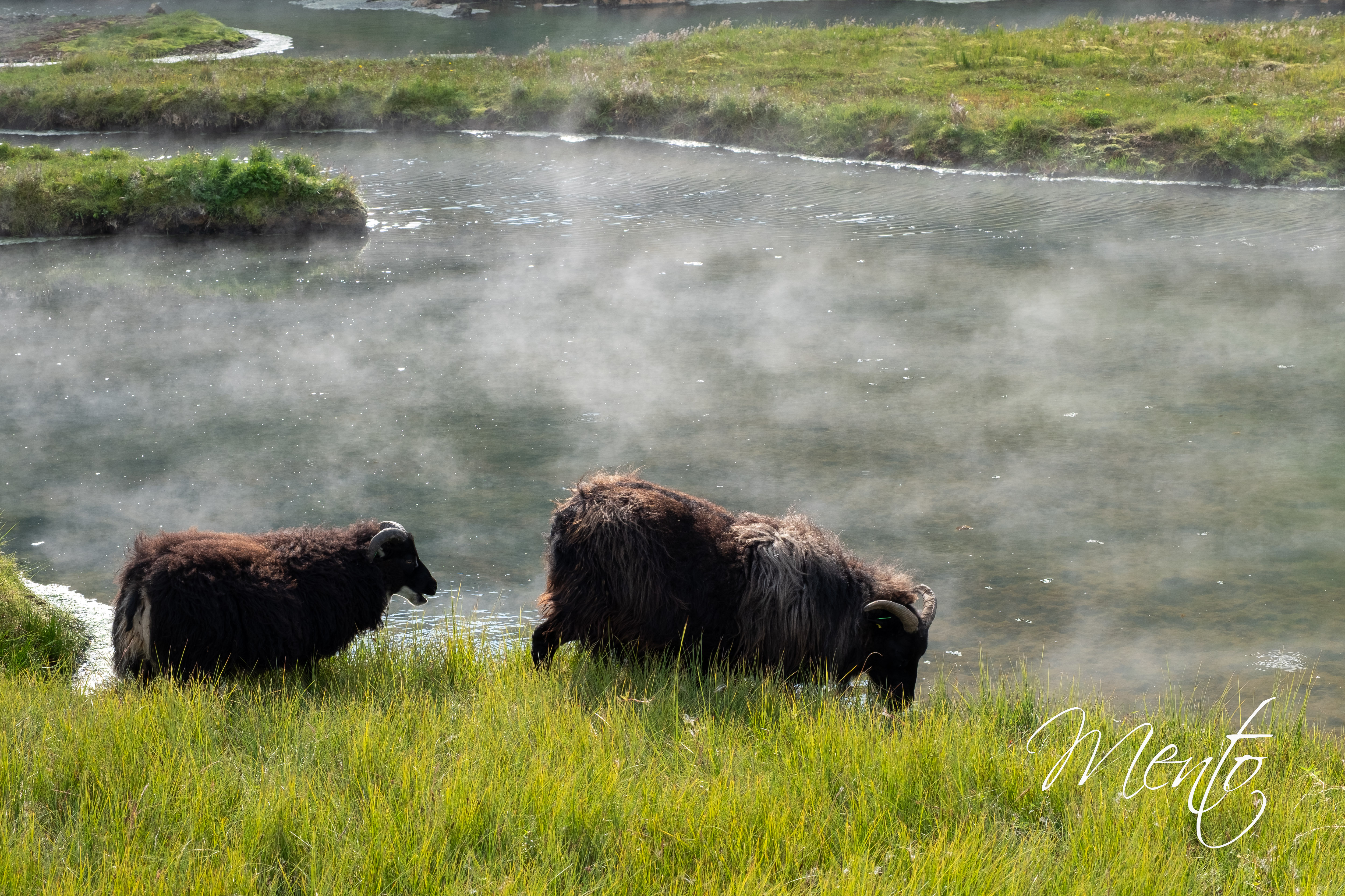 Nos acercamos caminando y nos entretenemos un ratito viendo los intentos de vadear el río de distintos vehículos, algunos con prudencia y otros temerarios. Una pasarela de madera nos marca el camino hacia el centro de Información del parque. Poco antes de llegar a él hay una pequeña poza de aguas termales llena de gente bañándose. Es un lugar muy bonito, pero carteles advierten de que no se garantiza la salubridad del agua. Se dice que históricamente, los viajeros, pastores y colonos usaban estos manantiales para relajarse tras jornadas duras cruzando las Tierras Altas y todavía hoy lo hacen muchos turistas.