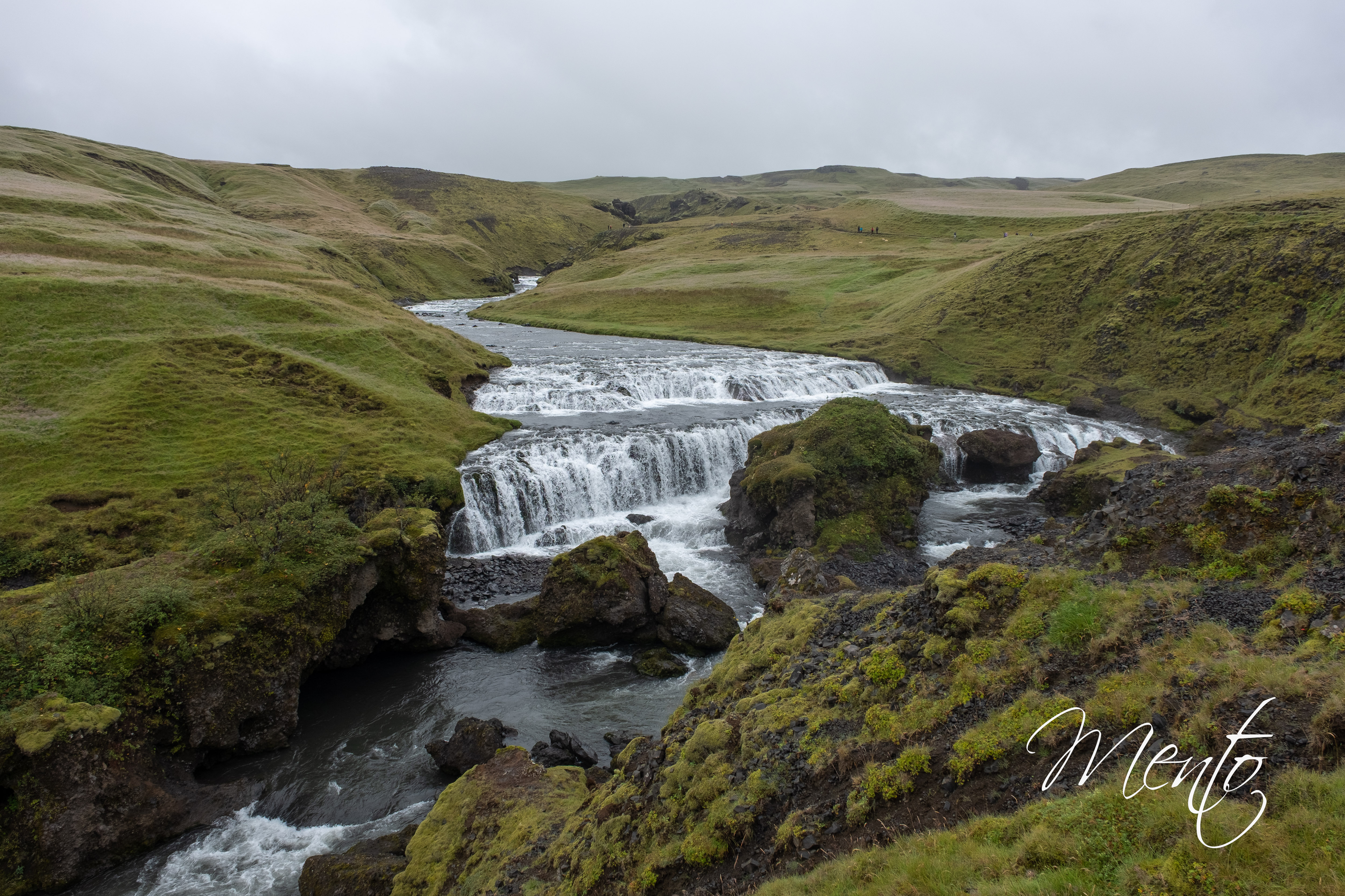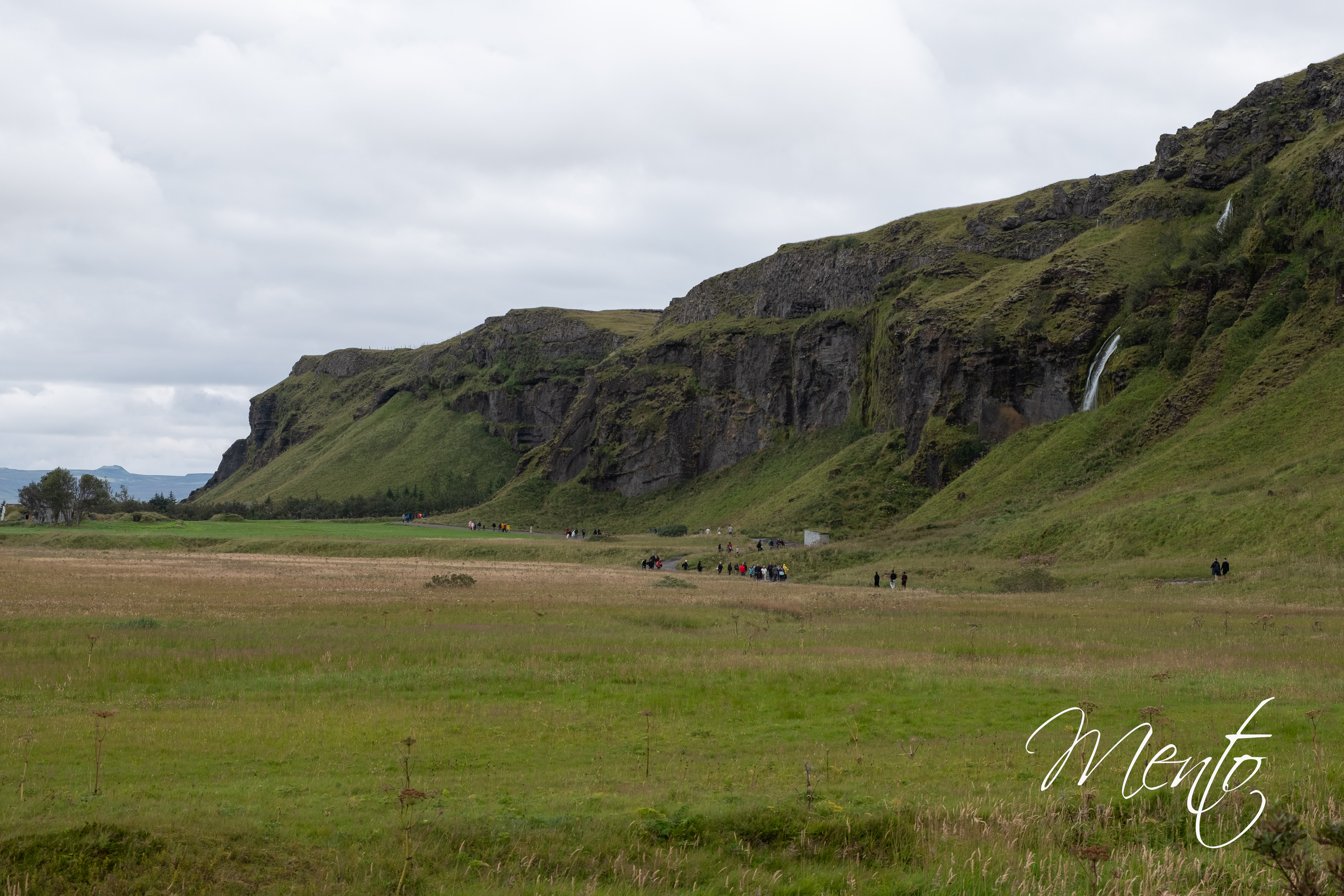 Comenzamos por Seljalandsfoss. La caída de agua se puede ver desde la carretera, según nos acercamos, pero antes que la cascada llama la atención la enorme colina verde que destaca en la llanura que la rodea. Poco a poco vamos distinguiendo que no hay una sino varias caídas de agua que se precipitan desde la altura.