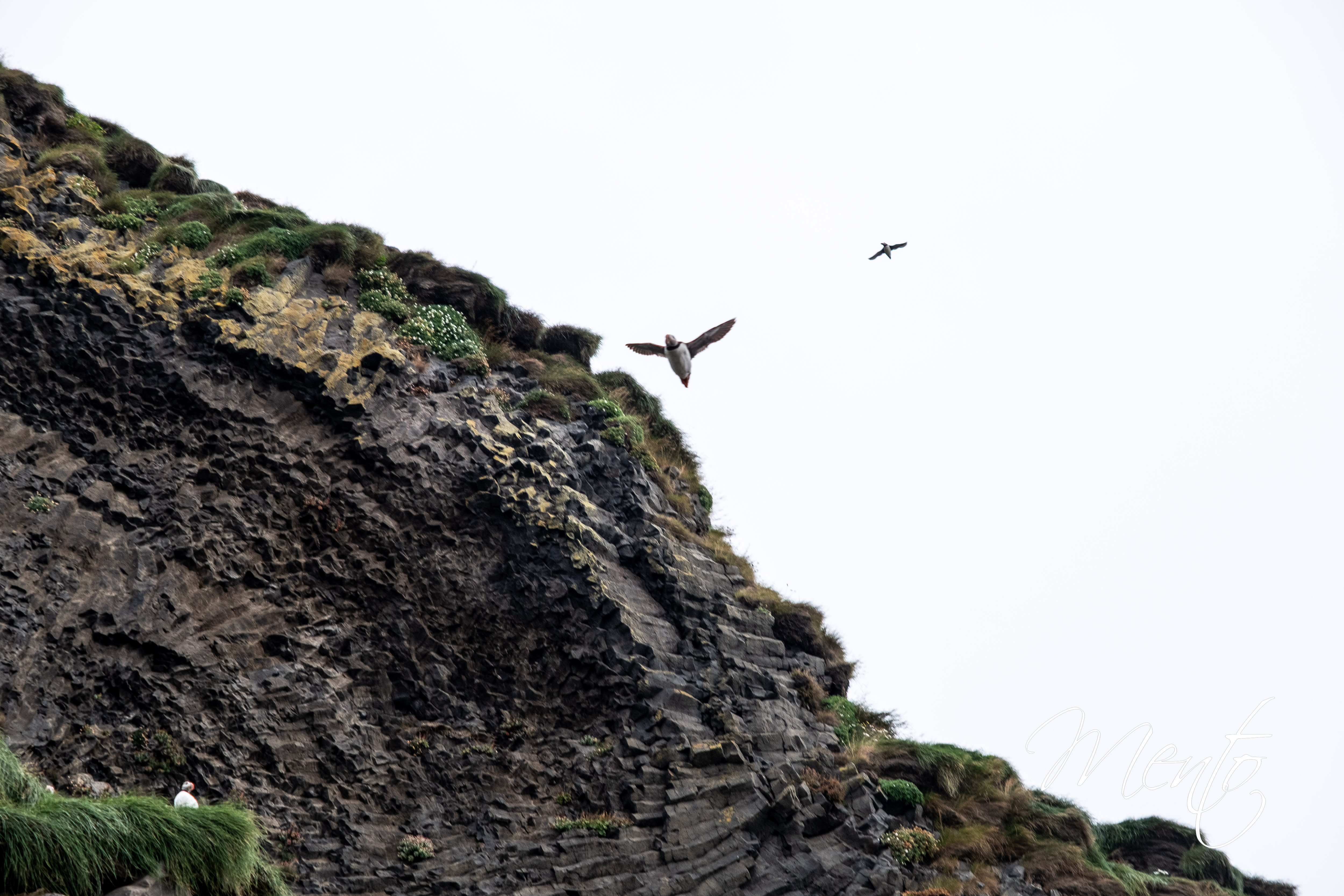 Comenzamos deshaciendo camino para regresar a los acantilados de Dyrhólaey, que ayer no pudimos llegar a ver. Aparcamos y nos disponemos a visitarlos bajo un fuerte viento. Además de las preciosas vistas sobre la playa Reynisfjara, nos sorprende la presencia de frailecillos, que nos hacen disfrutar un rato con su vuelo y presencia.
