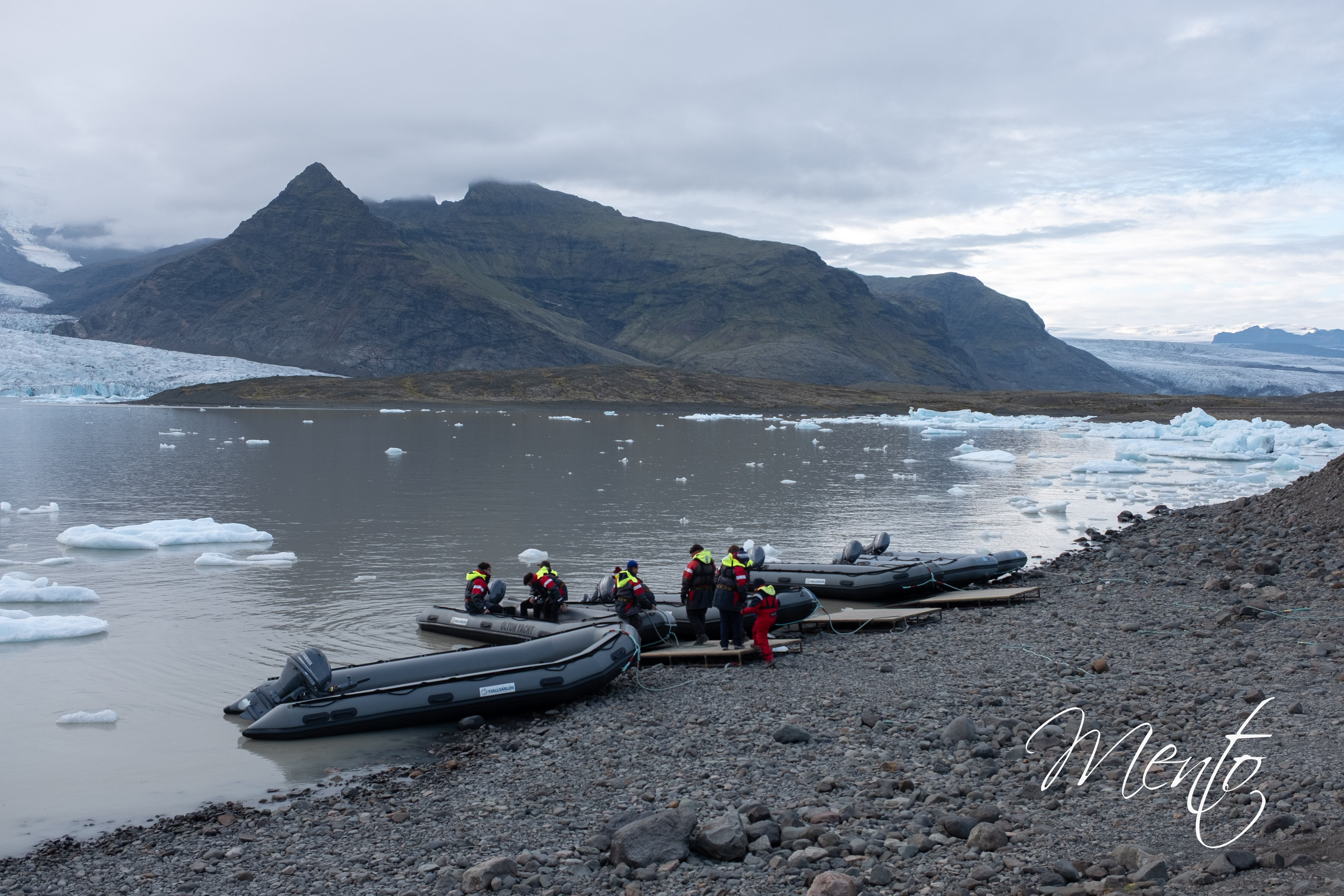 Nos dirigimos primero al glaciar Svínafellsjökull. Llegando se aprecia en toda su extensión el Skaftafell, cuya lengua está muy próxima. Aparcamos y un corto sendero nos acerca a la lengua de hielo. Primero pasamos un lago alpino muy bonito y después, subiendo una pequeña colina, queda ante nosotros la enorme masa de hielo que termina en un lago con pequeños icebergs. La imagen que ofrece el conjunto es espectacular, pero debemos ponernos en camino si queremos llegar a tiempo al paseo en zodiac.