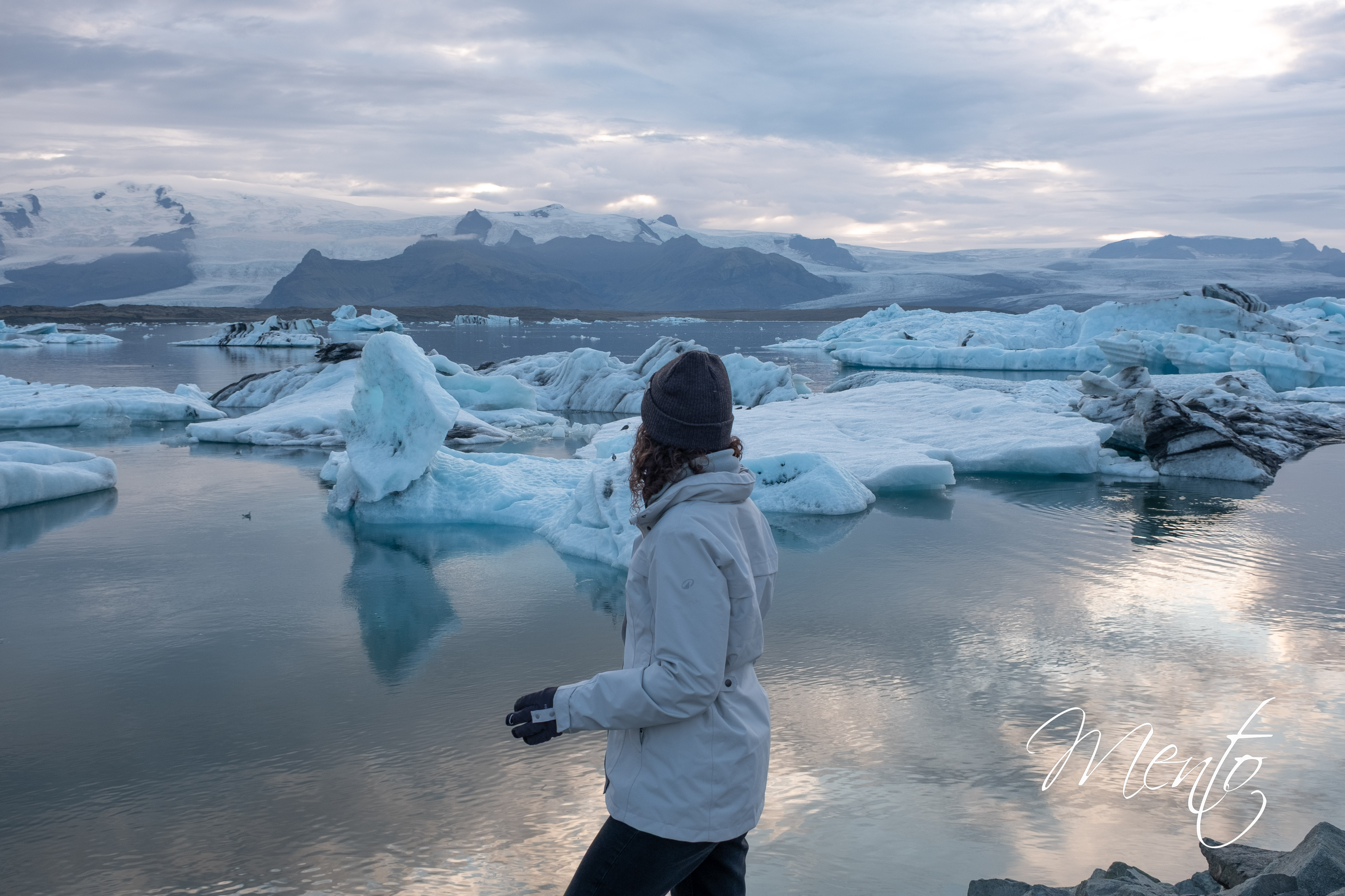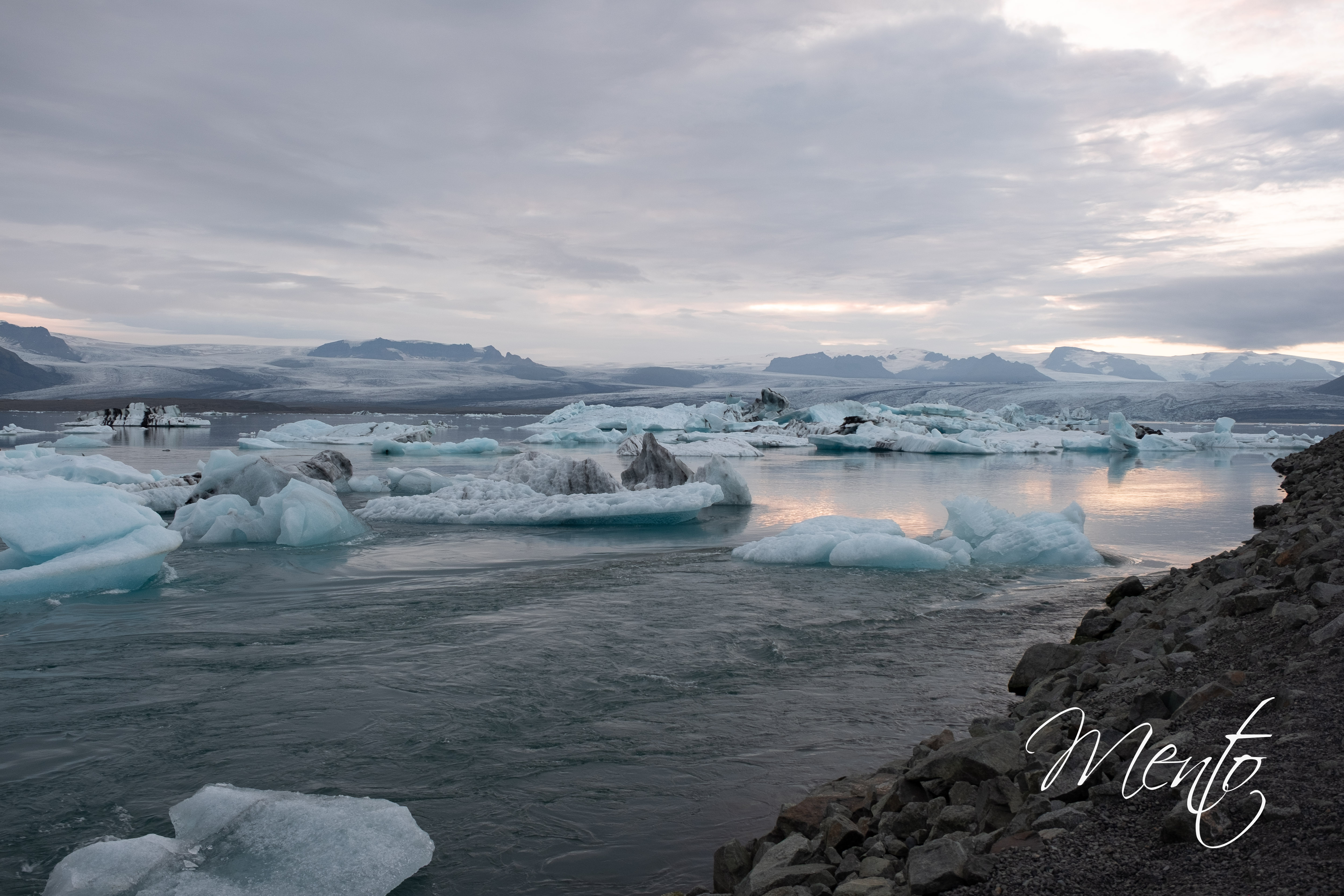 Al bajar del barco nos dirigimos, ahora sí, al lago Jökulsárlón. De nuevo nos sentimos sobrecogidos con las primeras vistas. La luz anaranjada del final de la tarde lo embellece todavía más. Jökulsárlón comenzó a formarse en la década de 1930 debido al retroceso del Vatnajökull. Hoy su profundidad alcanza los 250 metros, convirtiéndolo en el lago más profundo de Islandia. Sus icebergs, proceden de desprendimientos de la lengua de hielo Breiðamerkurjökull.