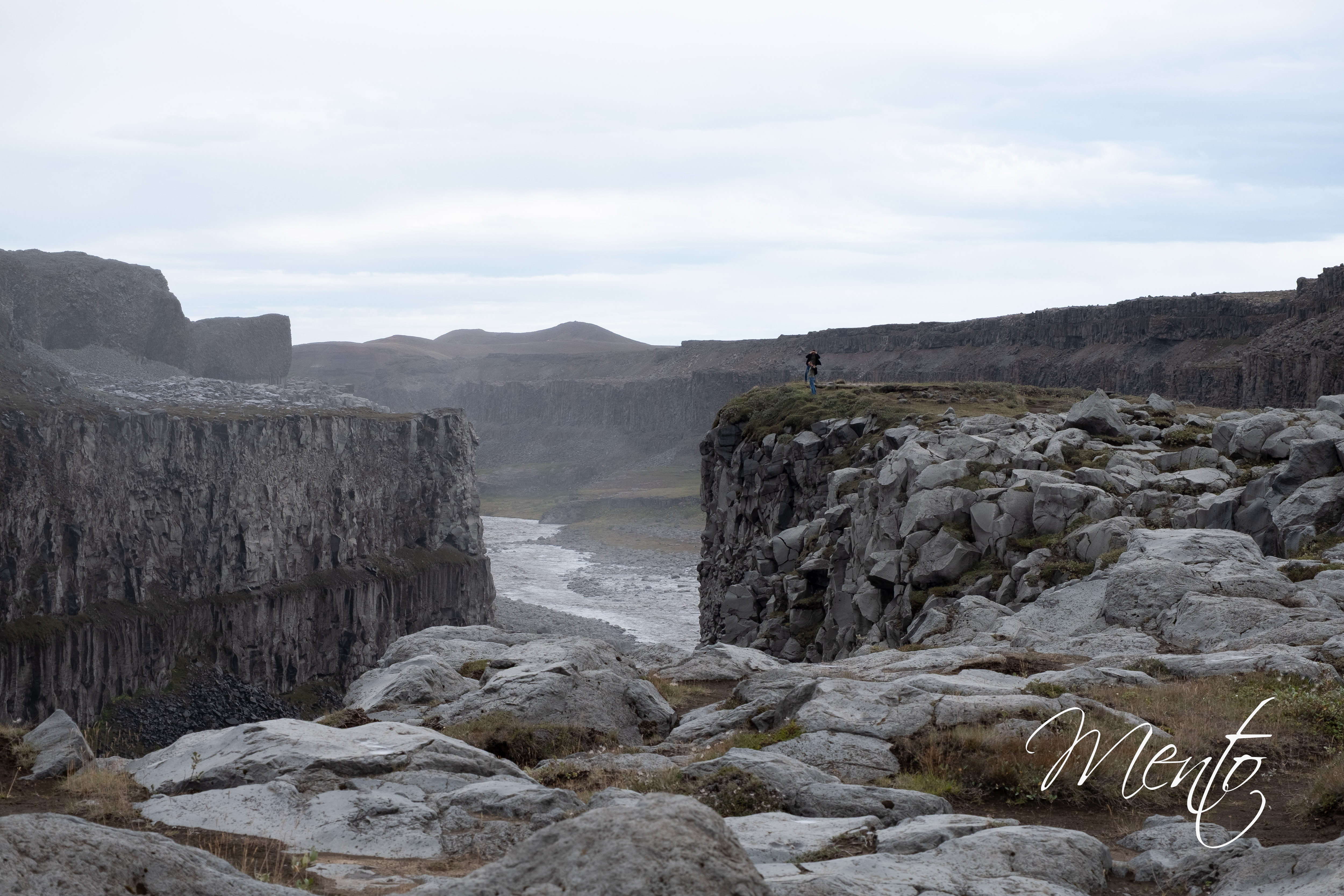El acceso al lado Este es por pista de tierra y solo está abierto en verano. Nosotros comenzamos con esta visita accediendo desde la 1 por la “carretera” 864. Entre nubes de polvo, llegamos al aparcamiento. En cuanto salimos caminando hacia el primer mirador comienza a llover levemente. El recorrido es corto. Pronto comienza a verse un enorme cañón abierto en este páramo desierto, como si la tierra se hubiera roto en dos. Al parecer, el cañón, llamado Jökulsárgljúfur, se formó por sucesivas erupciones y riadas glaciares catastróficas. En medio de esa grieta, circula el agua del caudaloso río que va creando a su paso impresionantes caídas de agua.
