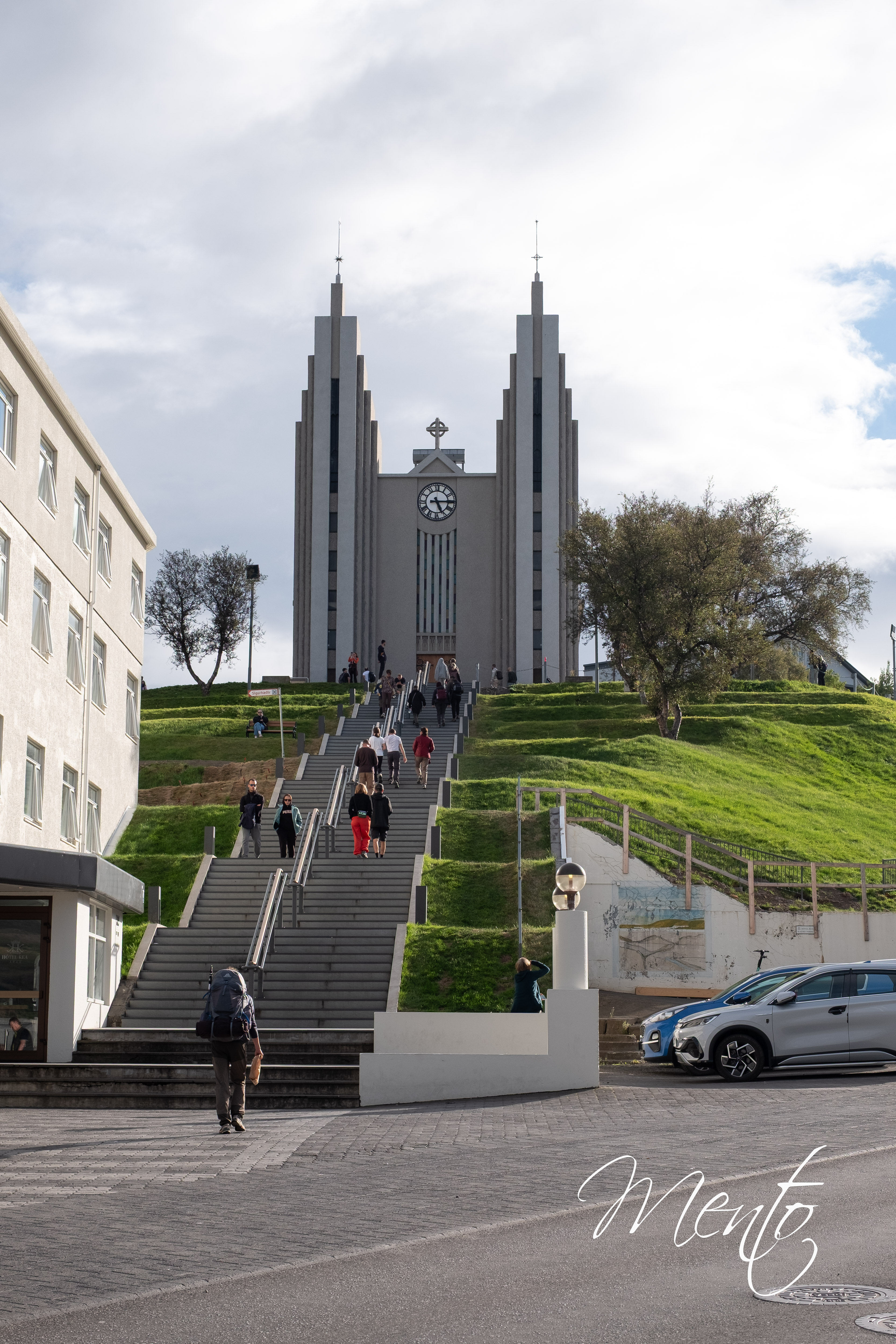Aparcamos cerca del puerto y damos un paseo. Un paseo muy breve porque es una ciudad pequeña. Recorremos la parte más céntrica de la calle peatonal Hafnarstræti que nos recuerda un poco a la de Tromsø en Noruega, llena de comercios y terrazas muy concurridas en esta tarde de verano y, al llegar al cruce con la calle Kaupvangsstrætisu, podemos ver sobre una colina su iglesia principal Akureyrarkirkja, diseñada por el mismo arquitecto que la de Reikiavik. Unas largas escaleras permiten acceder hasta ella y completan la imagen que no deja de tener su encanto. Además de a la iglesia de Reikiavik, nos recuerda un poco a la catedral de hielo de Tromsø cuyo diseño intenta evocar los picos nevados del ártico.