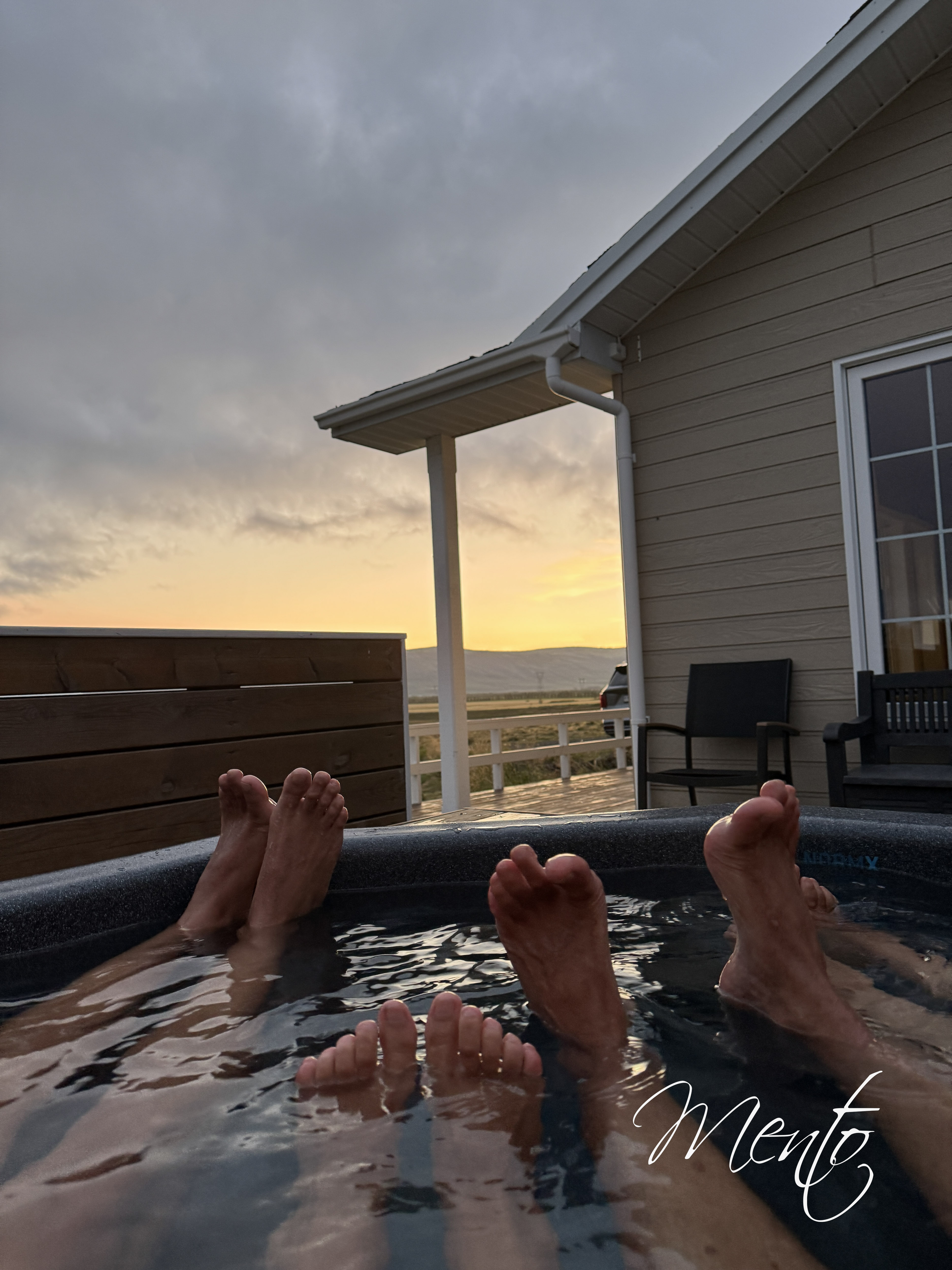 Terminada la vuelta y de nuevo en el coche regresamos a casa pasando junto a la cascada Gufufoss. Todavía nos espera un relajante baño disfrutando de las vistas mientras atardece. Además de los caballos, el animado grupo de patos ameniza la velada.