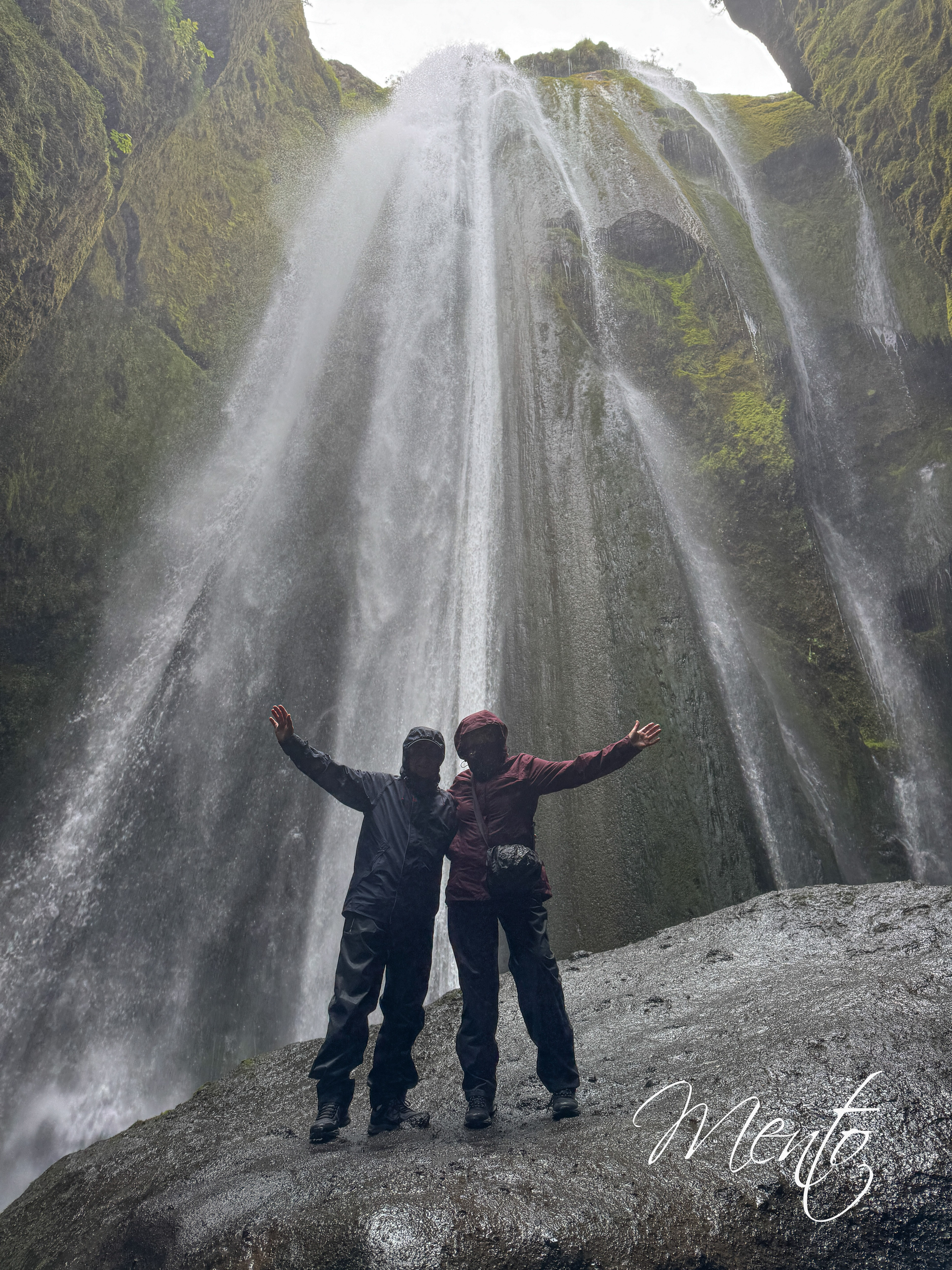 Desde allí caminamos hasta Gljúfrafoss o cascada del desfiladero, oculta en una especie de gruta. Solo Javier y yo llevamos pantalón impermeable, y dudamos antes de entrar, pero menos mal que lo hacemos: el espectáculo es sobrecogedor. Para acceder hay que bordear un río pisando piedras resbaladizas, y dentro el sonido del agua retumba entre las paredes húmedas. Hacemos fotos con el móvil, pero sobre todo disfrutamos del momento, casi hipnotizados.
