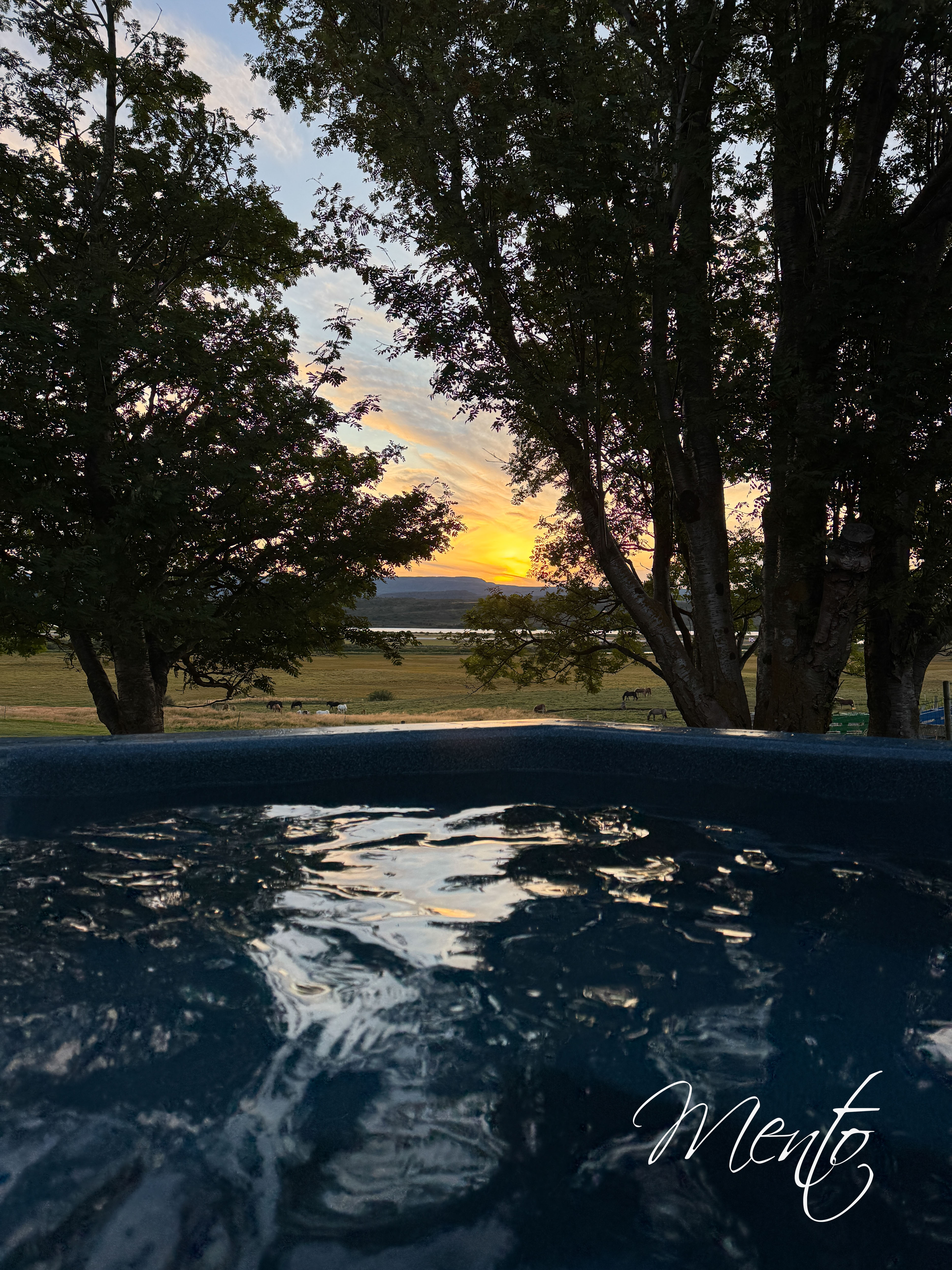 Terminada la visita y acompañados por una preciosa luz anaranjada de atardecer, vamos hacia la casa en la que nos alojaremos las próximas dos noches. Una preciosa casita blanca en el campo con un gran salón rodeado de cristaleras y con un jacuzzi exterior que aprovecharemos cada día.
