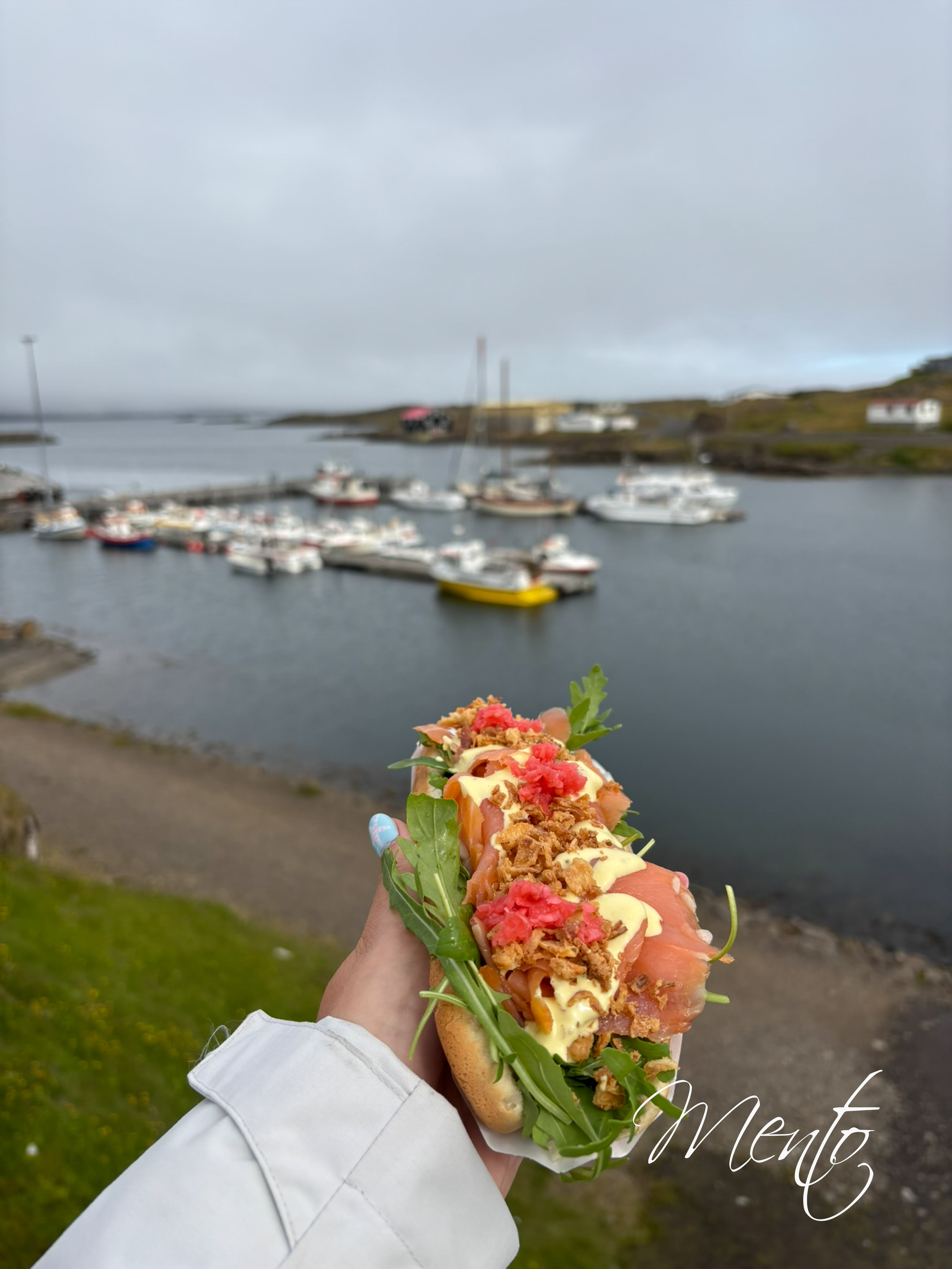 Paramos a repostar, compramos provisiones y aprovechamos para curiosear en una tienda de recuerdos. Cerca de allí, un pequeño puesto con mesas al aire libre ofrece bocadillos de salmón islandés, fresco y de sabor intenso, un auténtico manjar del país. Coincidimos con unos viajeros que conocimos en las Tierras Altas y nos recomiendan probarlos: tienen razón, están deliciosos.