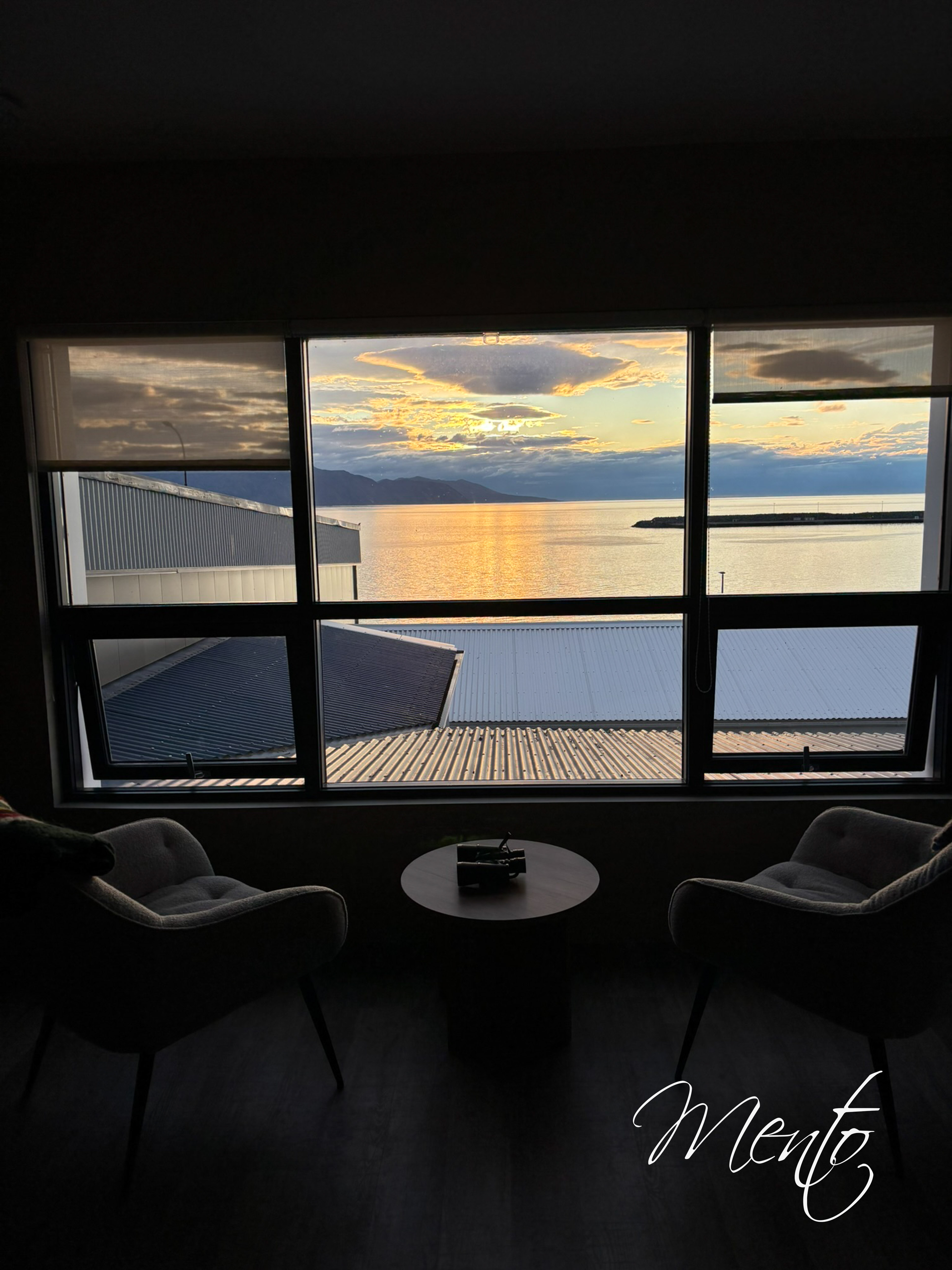 Nuestro alojamiento en el centro de Husavík es un apartamento de dos plantas sobre un supermercado y lo mejor de él es la enorme cristalera con vistas al mar del salón y de la habitación principal. Preparamos la cena y la disfrutamos con vistas al atardecer. Hoy no tenemos hot tub.
